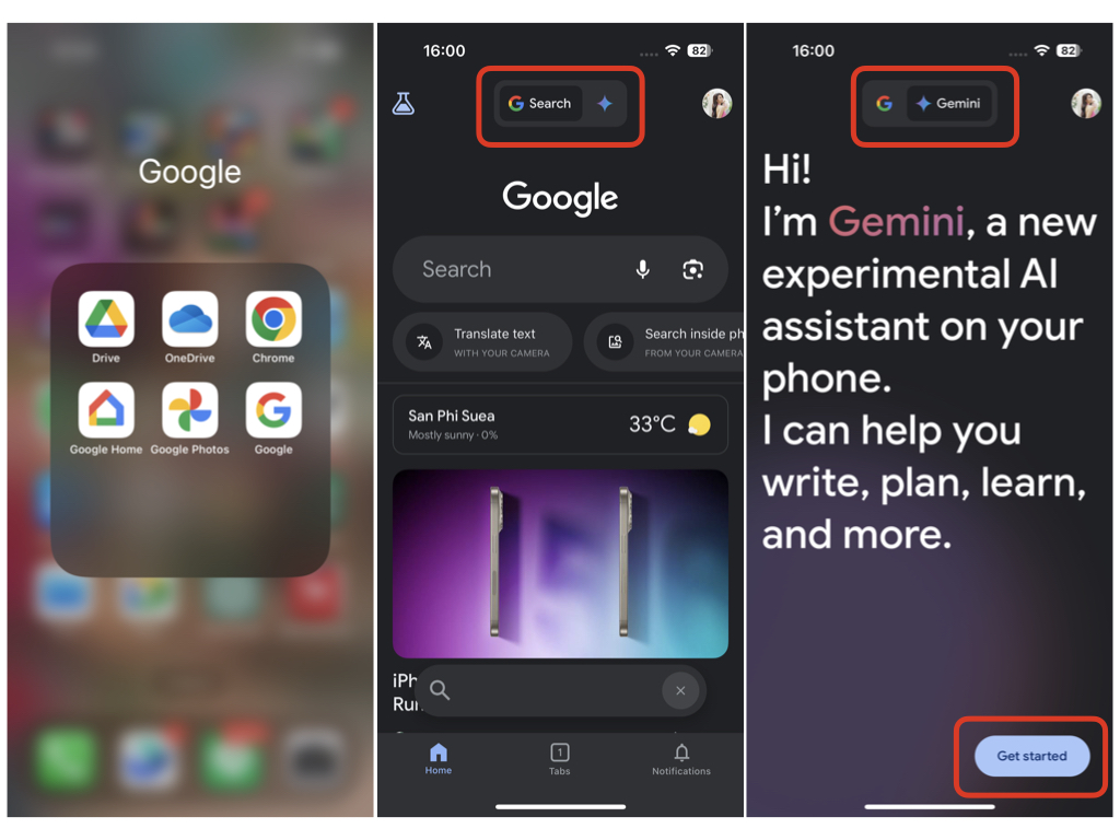 สำหรับการใช้งานแอป Gemini บน iPhone จะใช้งานได้ผ่านแอป Google ส่วนแอปพลิเคชันคาดว่าจะปล่อยให้ดาวน์โหลดภายหลังที่ App Store วิธีการคือไปที่ แอป Google > แตะที่ไอคอน Gemini > Get started
