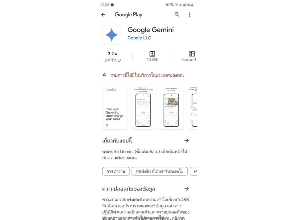 ส่วนแอป Gemini สำหรับ Android สามารถใช้งานร่วมกับ Google Assistant ได้ แต่ในตอนนี้ยังไม่เปิดให้ใช้บริการในไทย หากต้องการใข้งานก็สามารถใช้บริการผ่านเบราว์เซอร์ Gemini.google.com ได้เช่นกัน
