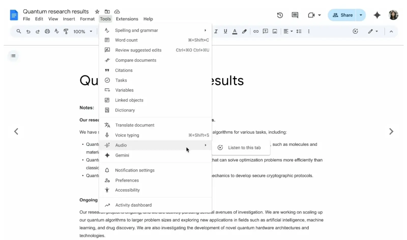 ตามตัวอย่างเมื่อต้นปี 2025 ตอนนี้ Gemini ใน Google Docs ให้ผู้ใช้สามารถ “สร้างเอกสารในรูปแบบเสียง” ได้แล้ว