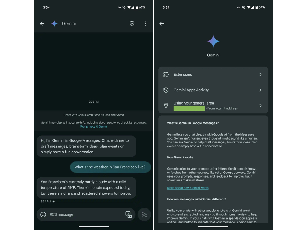การใช้ Gemini บน Google Message จะเป็นการคุยแชทผ่านข้อความด้วยการป้อนคําถามลงไปเหมือนการใช้ Gemini บนเว็บไซต์ โดย Gemini ที่ใช้อยู่ในเวอร์ชัน Gemini 1.0 Pro ที่ปรับให้เหมาะสมเพื่อให้ได้คําตอบที่กระชับยิ่งขึ้น มีการรองรับ Gemini Extensions เพื่อเข้าถึง Workspace (Gmail, Drive และ Docs), Maps, Flights, Hotels & YouTube ด้วย