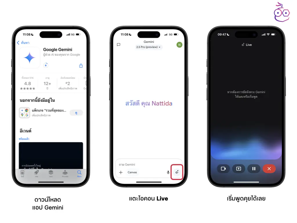วิธีใช้: เข้าไปที่แอป Gemini > แตะไอคอน Live เพื่อใช้งาน Gemini Live > เริ่มพูดคุยได้เลย