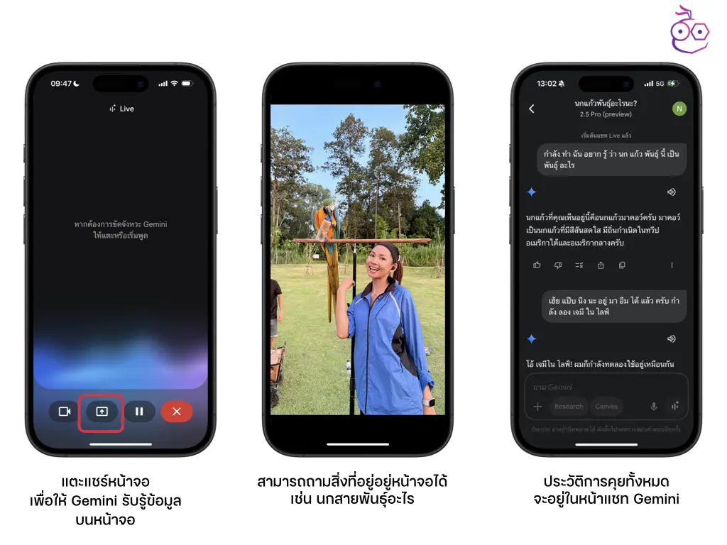 สำหรับฟังก์ชันแชร์หน้าจอ เมื่อเปิดใช้งานแล้วผู้ใช้งานสามารถถาม Gemini เกี่ยวกับสิ่งที่อยู่บนหน้าจอได้เลย