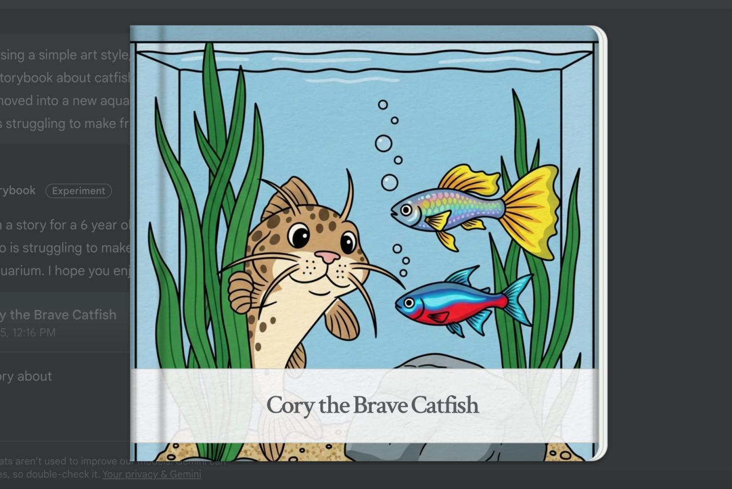 ผู้เขียนเล่าว่า “ฉันขอให้ Gemini สร้างเรื่องราวเกี่ยวกับปลาดุกที่พยายามผูกมิตรในตู้ปลาใหม่” เมื่อฉันเลื่อนดูตามหน้าต่าง ๆ พบว่าโครงเรื่องที่มันสร้างขึ้นเกี่ยวกับสัตว์ในตู้ปลาที่พยายามจะย้ายลูกหินนั้นค่อนข้างน่าเบื่อ แต่นอกเหนือจากนั้น ทุกอย่างก็ดูเป็นมาตรฐานสำหรับนิทานเด็กที่สร้างโดย AI จนกระทั่งฉันเจอภาพประกอบหนึ่งที่ใส่แขนคนลงบนตัวปลา