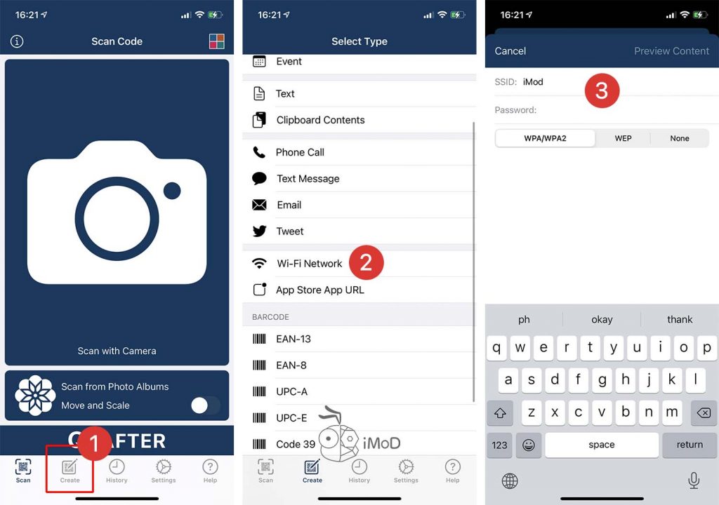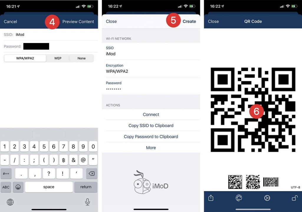 เปิดแอป Qrafter เลือก แตะ Create > แตะ Wi-Fi Network > กรอกชื่อ Wi-Fi ในช่อง SSID และกรอกรหัสผ่าน Wi-Fi