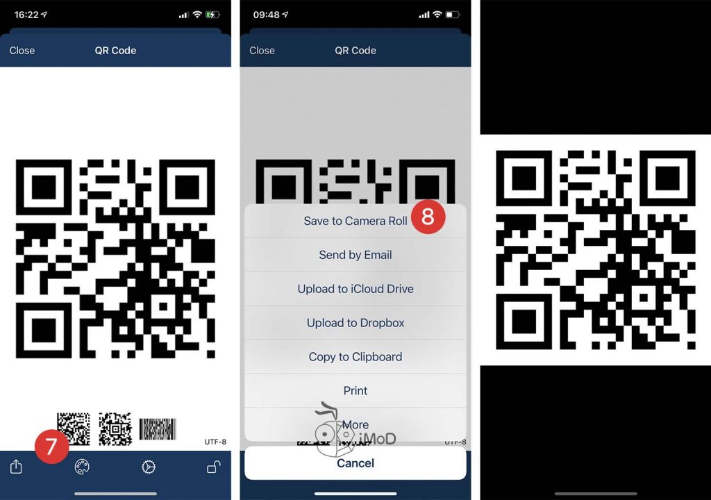 แตะไอคอนแชร์ด้านล่าง > บันทึกรูปในอัลบั้ม Save to Camera Roll > จากนั้นก็ใช้ภาพ QR Code ไปสแกน