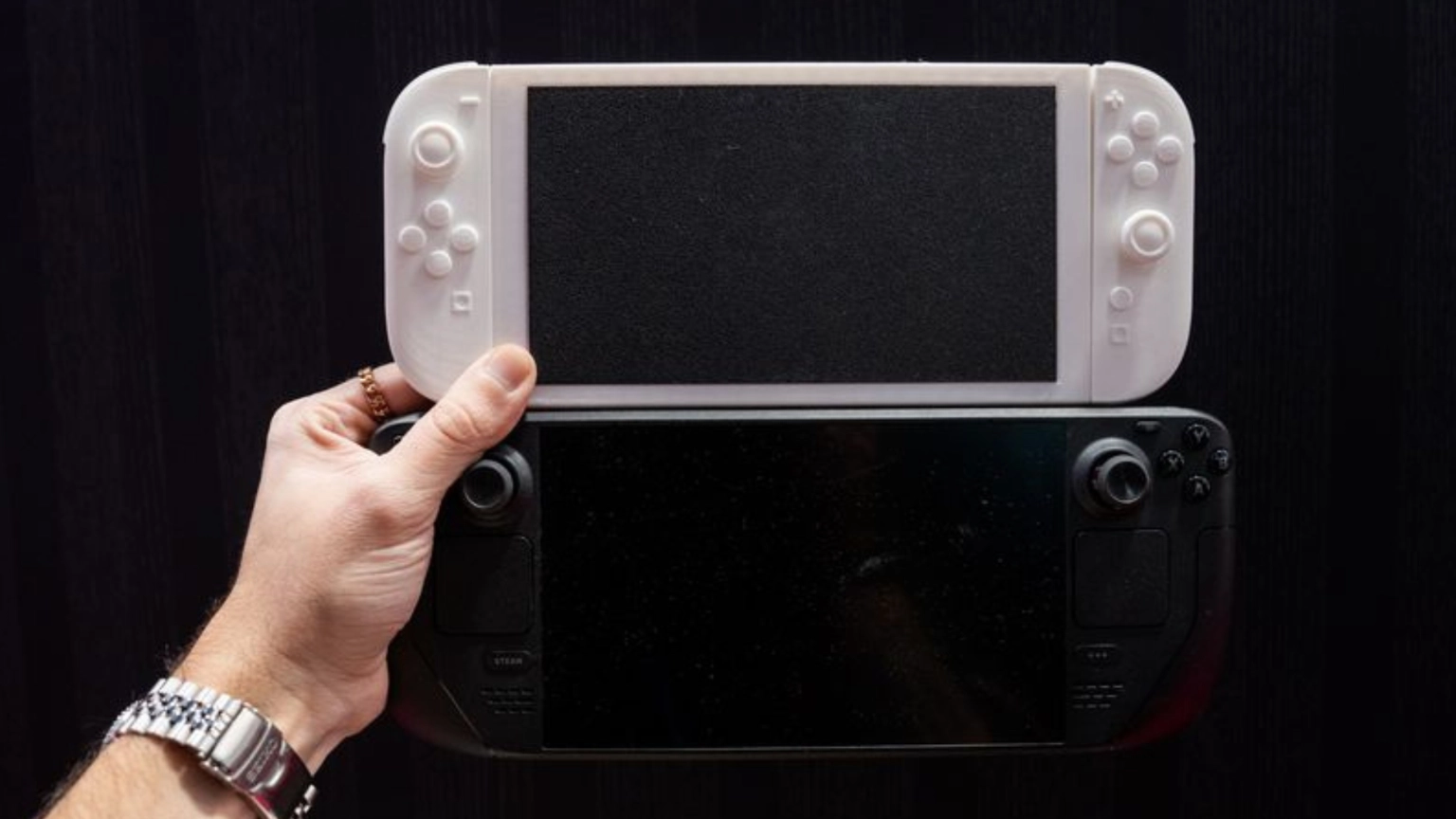 โมเดลของ Switch 2 คอนโซลรุ่นต่อไปของ Nintendo ดูเหมือนจะกว้างกว่ารุ่นเดิม โดยมีจอยคอนที่ใหญ่ขึ้นเล็กน้อย ซึ่งดูเหมือนจะจับถนัดมือกว่า เมื่อเปรียบเทียบกับ Steam Deck OLED โมเดล Switch 2 ยังคงรู้สึกเล็กกว่าอย่างเห็นได้ชัด ส่วนหนึ่งเป็นเพราะจอยคอนไม่ได้โดดเด่นและให้ความรู้สึกสบายมือเท่ากับการจับของ Deck แต่โมเดลยังคงรู้สึกใกล้เคียงกับขนาดของเครื่องพกพาของ Valve มากกว่า Switch รุ่นเดิม