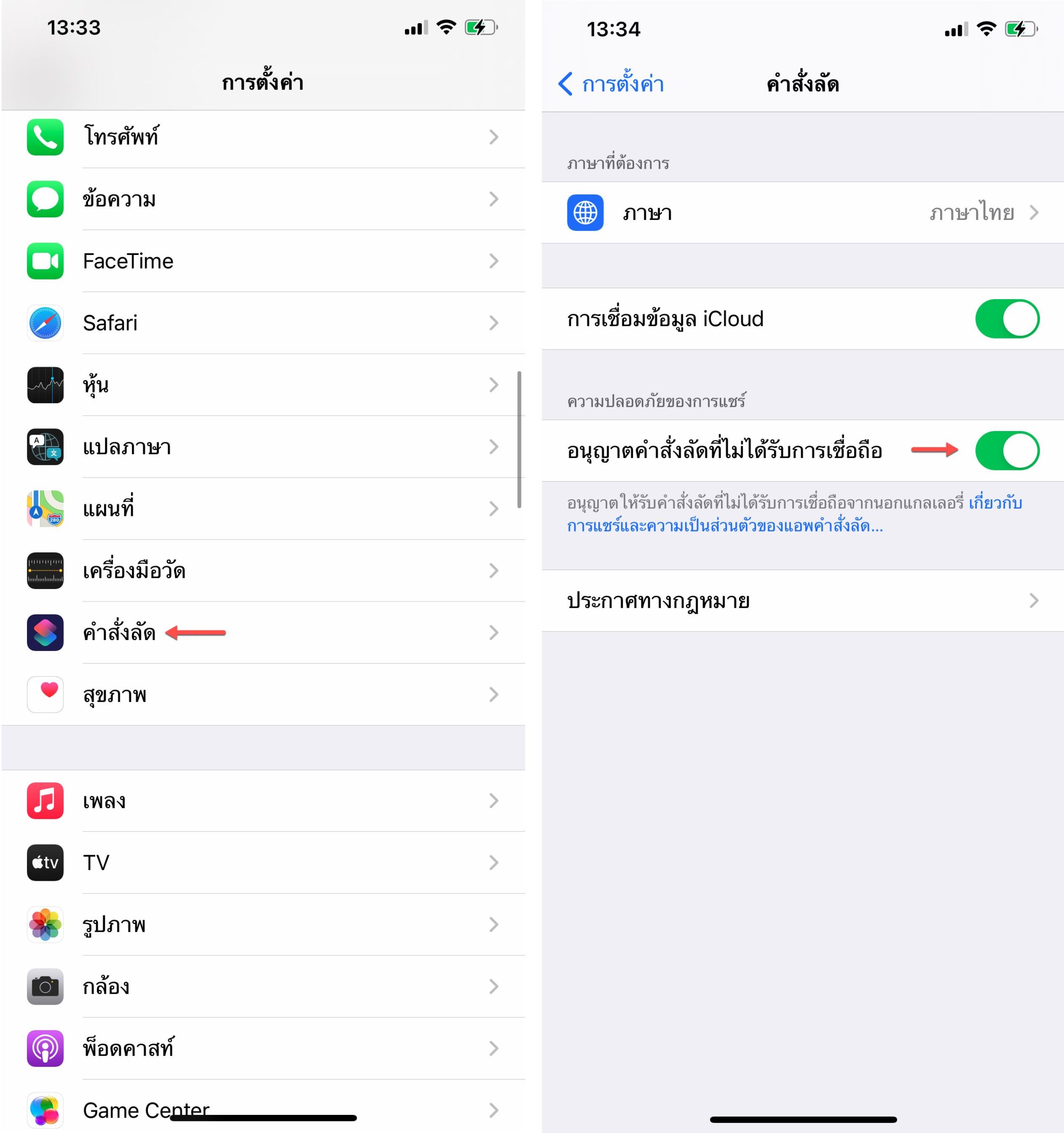 ไปที่การตั้งค่า > คำสั่งลัด > เปิด อนุญาตคำสั่งลัดที่ไม่ได้รับการเชื่อถือ