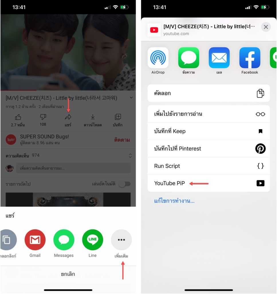 การใช้งานนั้นให้เราเปิดวิดีโอใน YouTube ที่เราต้องการ > แตะ แชร์ > เลื่อนไปที่ เพิ่มเติม > จากนั้นเลื่อนลงมาล่างสุด > แตะ YouTube PiP