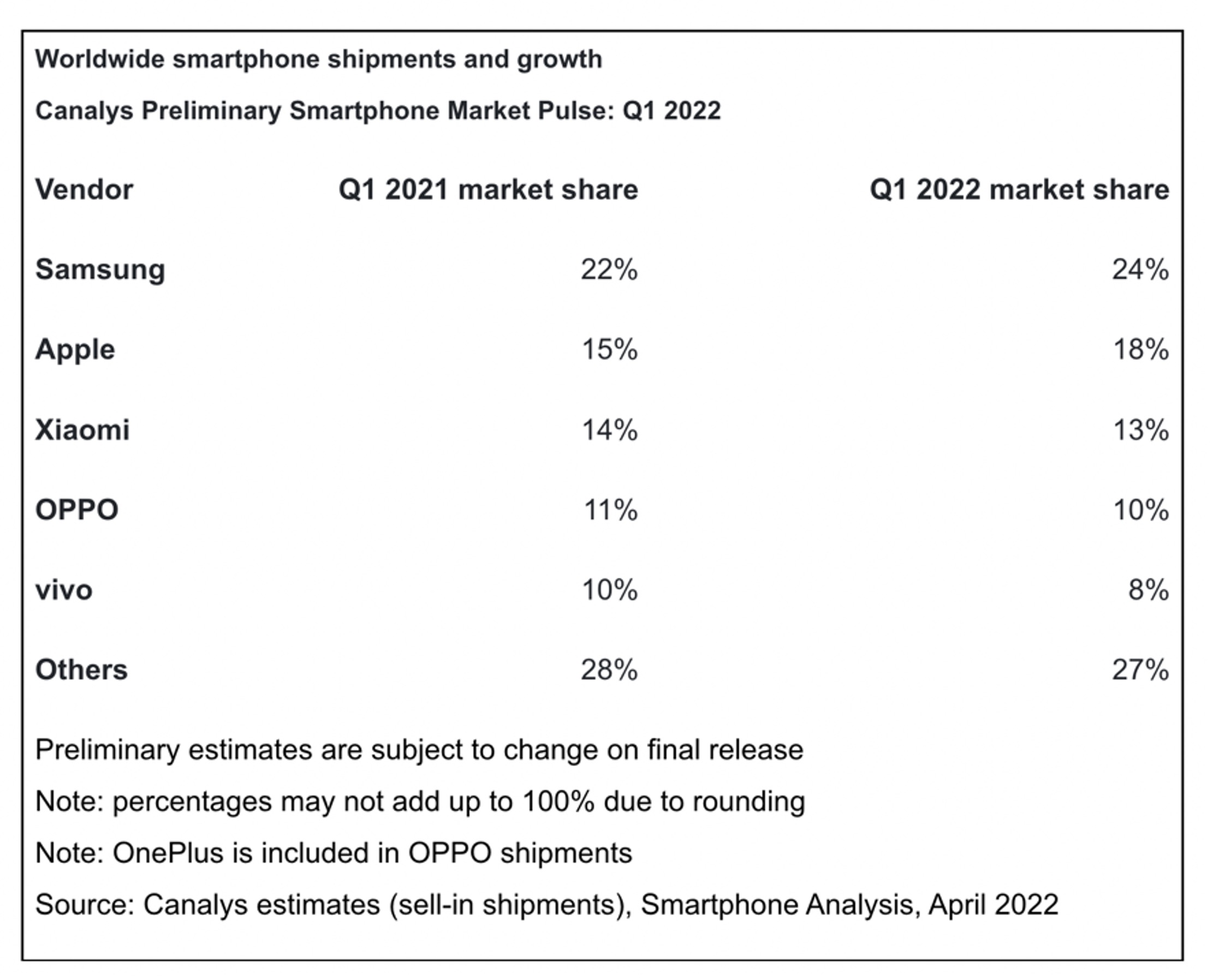 Canalys รายงานข้อมูลว่ายอดส่งมอบสมาร์ตโฟนทั่วโลกในไตรมาส 1 ปี 2022 ลดลงไป 11% เมื่อเทียบกับปีก่อนหน้า โดย Samsung เป็นแบรนด์ที่มีส่วนแบ่งมากสุดอยู่ที่ 24% ตามด้วย Apple 14% และ Xiaomi 13%