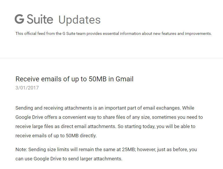 Google ได้อัปเดตให้ Gmail สามารถส่งอีเมลพร้อมแนบไฟล์รวมกันได้สูงสุด 25MB (แนบ 1 ไฟล์ ก็ได้สูงสุดที่ 25MB) และรับอีเมลที่แนบไฟล์ขนาดใหญ่ที่ 50MB ได้แล้ว
