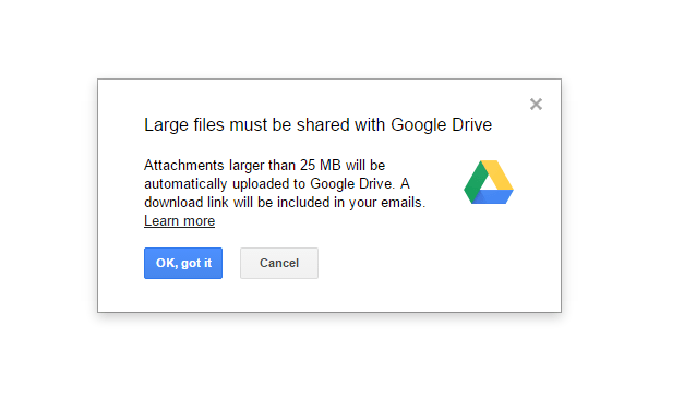 ดังนั้น Google จึงอัปเดตให้ Gmail สามารถรับอีเมลที่มีไฟล์แนบขนาด 50MB ได้ ส่วนการแนบไฟล์ในอีเมลส่งออกนั้นสามารถแนบไฟล์รวมกันได้สูงสุด 25MB (แนบ 1 ไฟล์ ก็ได้สูงสุดที่ 25MB) และหากแนบไฟล์ที่ขนาดใหญ่กว่า 25MB Gmail จะขึ้นแจ้งเตือนแนะนำว่าจะอัปโหลดไฟล์แนบผ่าน Google Drive และสร้างลิ้งค์ดาวน์โหลดให้โดยอัตโนมัติ