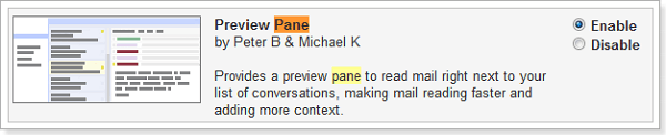 หลังจาก Log in เข้าสู่ Gmail แล้วให้เลือกที่ Laps จะอยู่มุมบนขวาลองๆหาดูนะครับ จากนั้นพอเข้าไปที่ Labs ได้แล้วค้นหา (กด Ctrl+F) ด้วยคำว่า Preview Pane และติ๊ํกค่าที่ Enable แล้วกด Save Settings ที่ด้านล่างสุด