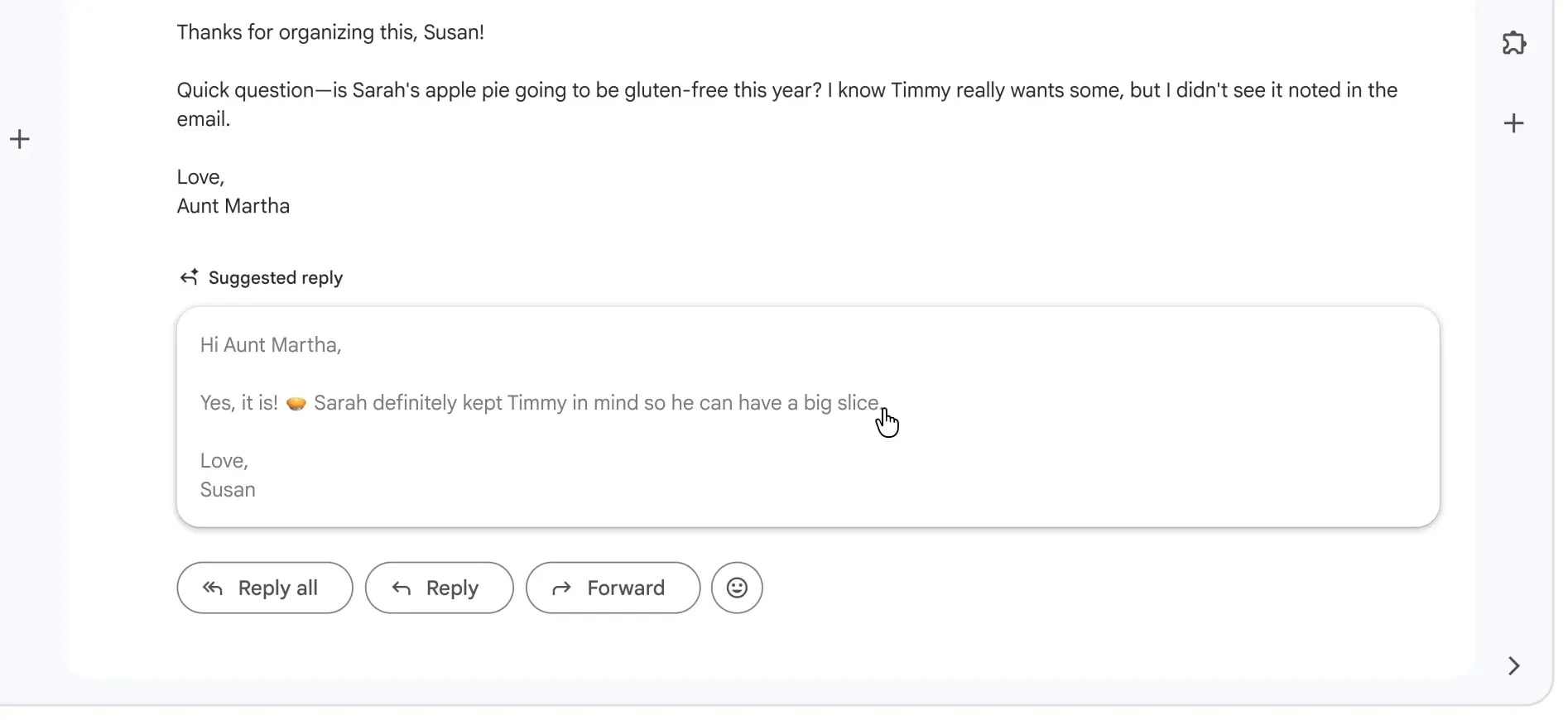 พัฒนามาจาก Smart Replies โดยจะวิเคราะห์บริบทของบทสนทนา และเลือกใช้ภาษาหรือโทนที่ผู้ใช้มักใช้บ่อย ตัวอย่างเช่น ถ้ามีอีเมลเรื่องขอเปลี่ยนวันประชุม ระบบจะร่างคำตอบที่ดูเหมือนผู้ใช้เขียนเองขึ้นมาให้ก่อน จากนั้นผู้ใช้สามารถตรวจสอบก่อนส่งได้