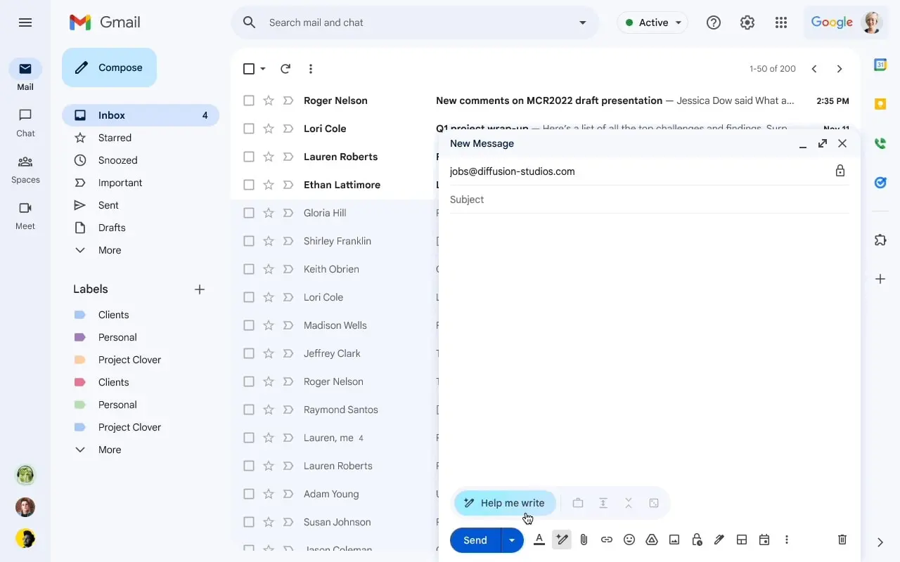 ช่วยเขียนอีเมลจากข้อความที่ผู้ใช้ป้อนเข้าไป ระบบสามารถปรับสำนวนได้หลายแบบ เช่น ทำให้เป็นทางการ ขยายเนื้อความ หรือย่อให้กระชับ นอกจากนี้ยังสามารถนำข้อความที่เขียนไว้แล้วมาแต่งให้ดูดีขึ้นได้ ฟีเจอร์นี้ใช้งานได้ทั้งบนเว็บ Android และ iOS โดยกดปุ่มรูปปากกาที่มีสัญลักษณ์ AI
