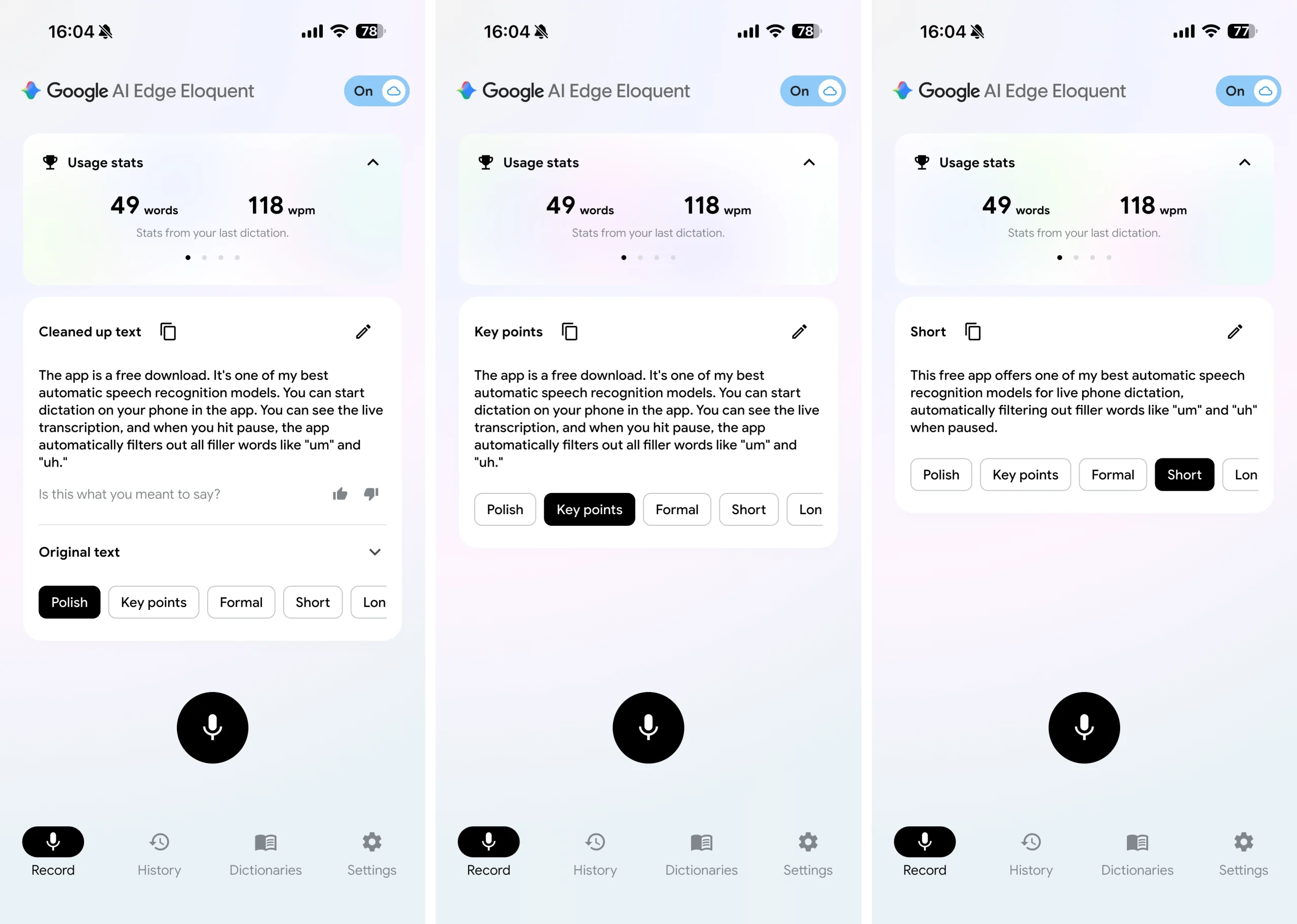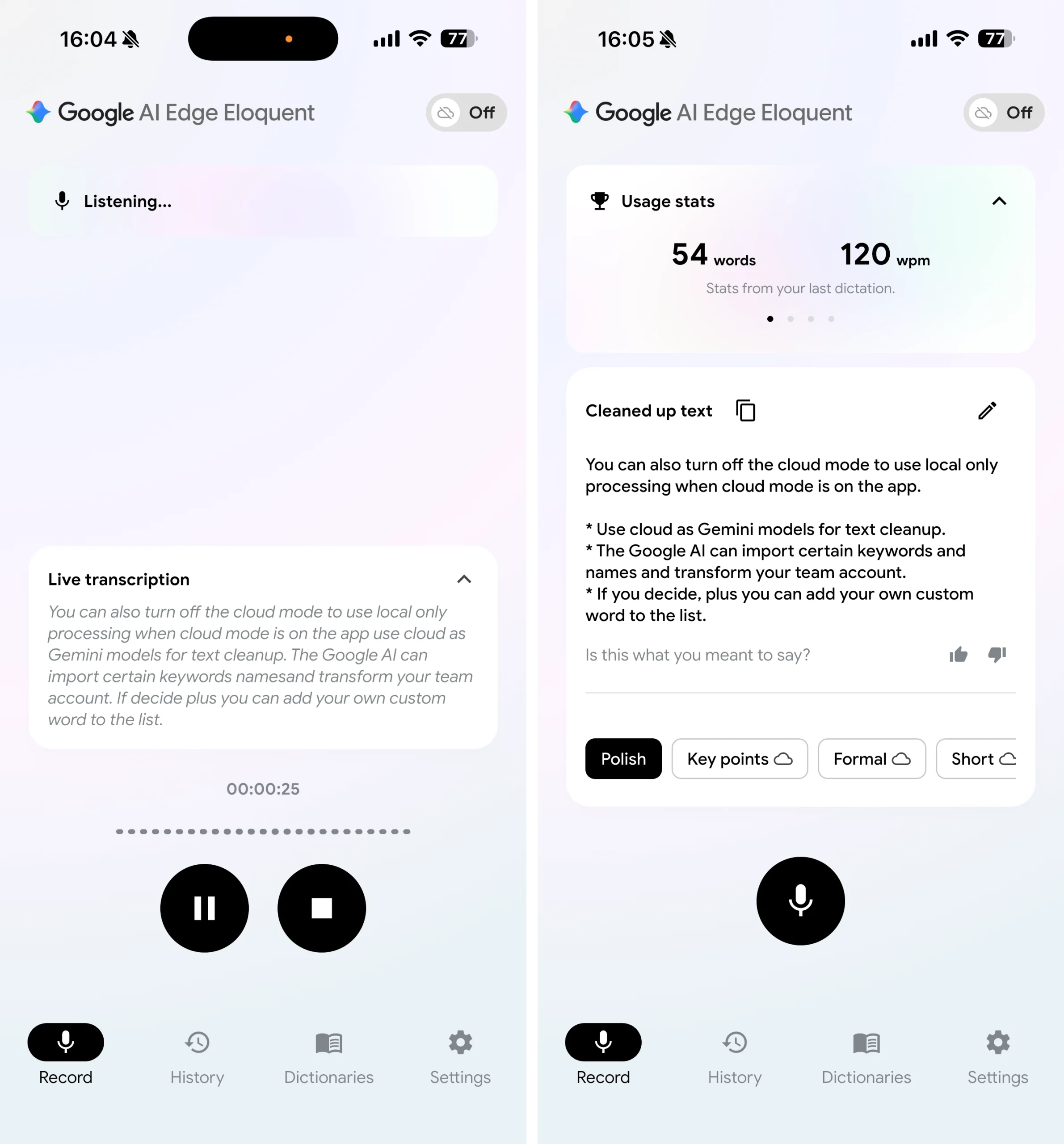 หลังจากดาวน์โหลดโมเดลเสียงลงในอุปกรณ์แล้ว ผู้ใช้สามารถพูดเพื่อแปลงเป็นข้อความได้แบบ Real-times ทันที ตัวแอปยังสามารถช่วยปรับข้อความให้ดูดีขึ้นโดยอัตโนมัติ เช่น การลบคำฟุ่มเฟือย ปรับประโยคให้ลื่นไหล หรือเปลี่ยนโทนของข้อความให้เหมาะสม เช่น สรุปแบบสั้น ยาว หรือโทนทางการ