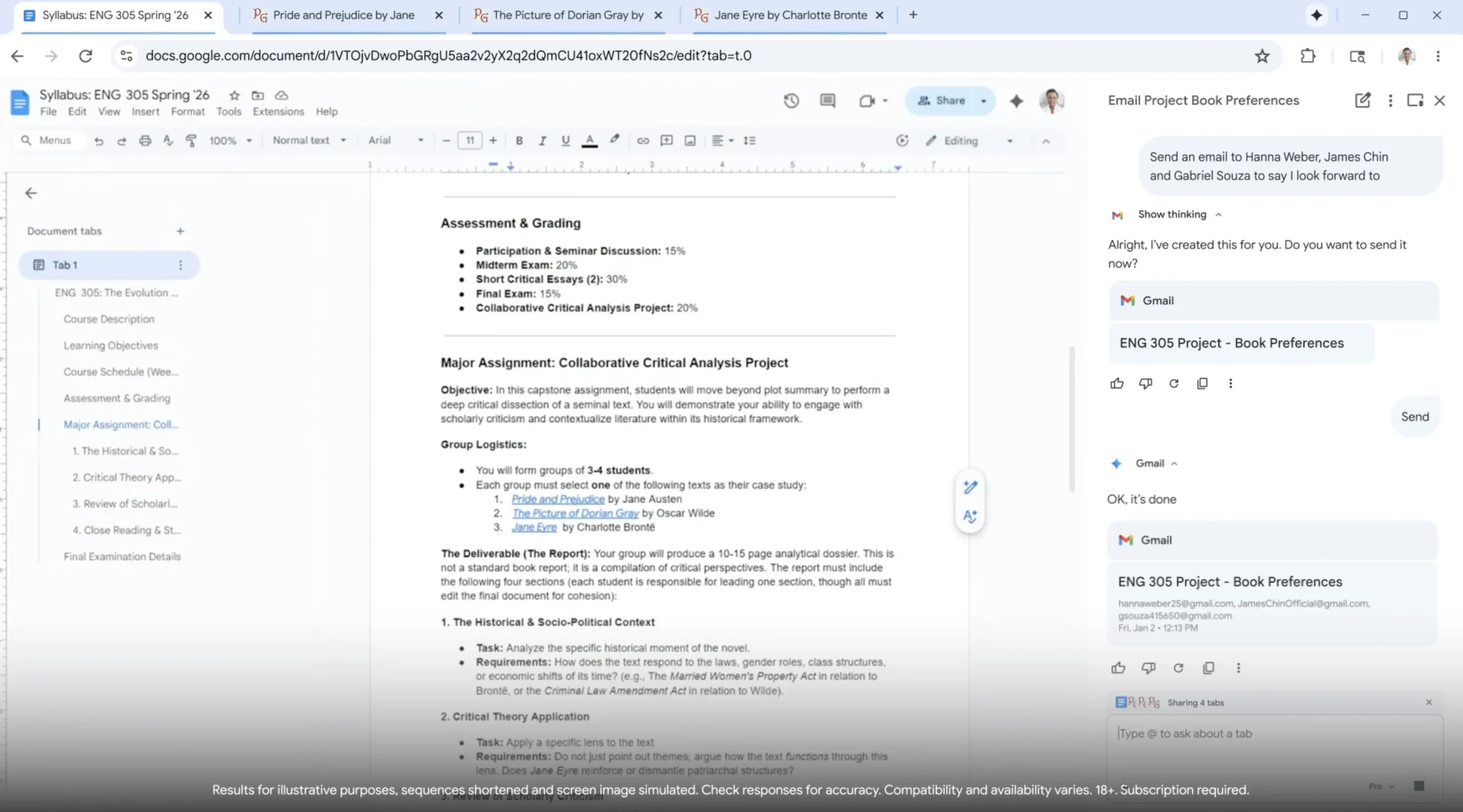 Chrome ที่ใช้งานร่วมกับ Gemini ได้รองรับฟีเจอร์ Connected Apps แล้ว ซึ่งช่วยให้ผู้ช่วยดึงข้อมูลจากบริการอื่น ๆ ของ Google เช่น Gmail และ Calendar ได้ เช่น ในการสาธิตระหว่างการแถลงข่าว พนักงานของ Google ได้ให้ Gemini ค้นหาวันที่ที่ลูกจะปิดเทอมเดือน มี.ค. โดยไม่ได้ระบุว่าจะให้ค้นหาจากที่ใด แต่ Gemini สืบค้นข้อมูลได้อย่างถูกต้องจากกล่องอีเมลของพนักงานคนนั้น