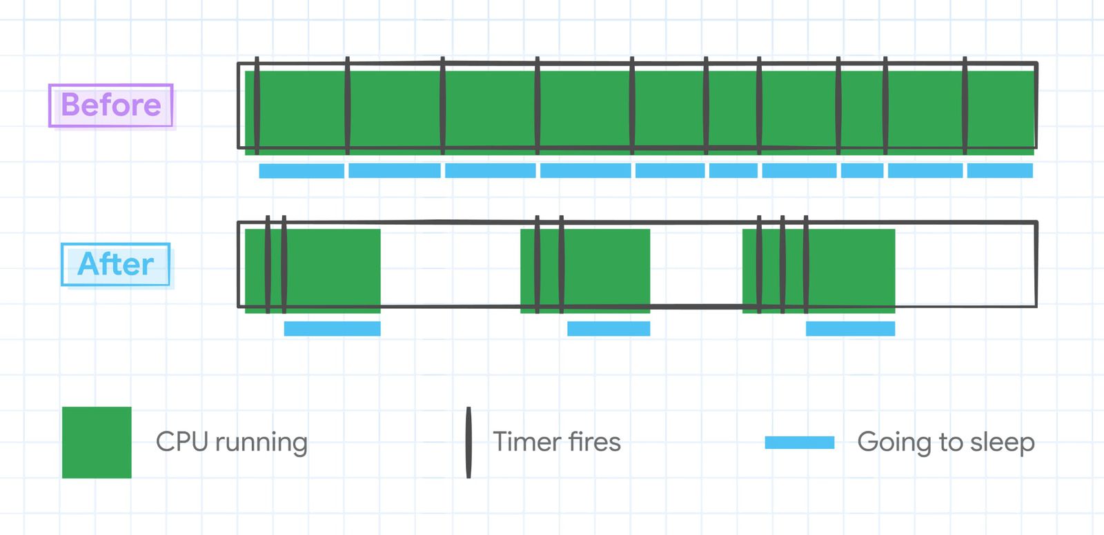 สำหรับการเพิ่มประสิทธิภาพการยืดอายุแบตเตอรี่นี้ Google ได้ปรับแต่ง iframe ให้ใช้พลังงานน้อยลง ปรับปรุง JavaScript Timer เพื่อลดการใช้งาน CPU รวมถึงปรับโครงสร้างข้อมูลให้มีประสิทธิภาพ และจำกัดการเขียนไฟล์ซ้ำที่ไม่จำเป็น