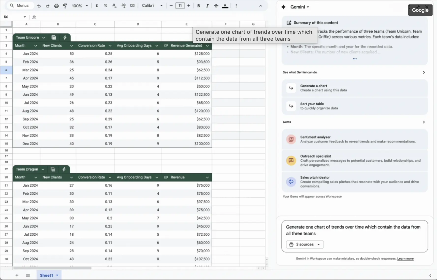 การอัปเดตใหม่ของ Google Sheets ได้รับการพัฒนาจาก Gemini ซึ่งช่วยให้การใช้งานตารางข้อมูลหลายตารางง่ายยิ่งขึ้น โดย Gemini จะช่วยวิเคราะห์และสร้างสูตรที่ซับซ้อนจากข้อมูลหลายแหล่งได้อย่างมีประสิทธิภาพมากขึ้น