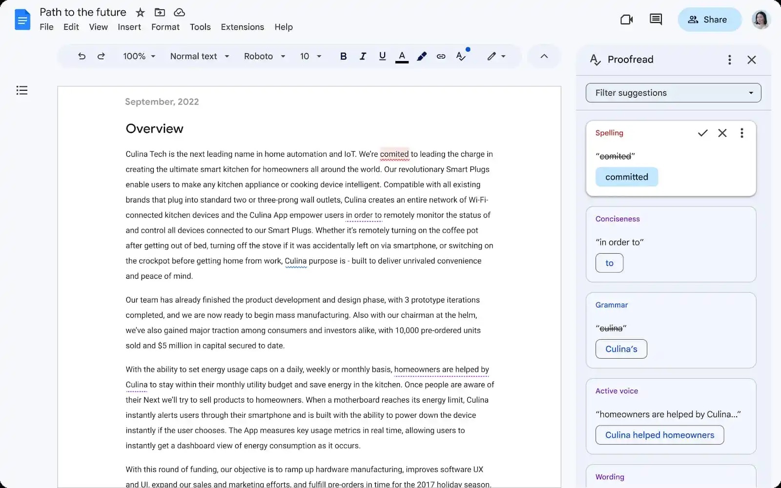 ฟีเจอร์ ‘Proofread’ Goolgle เรียกว่าเป็น “คำแนะนำการเขียนรุ่นถัดไปที่ขับเคลื่อนโดย AI” โดยจะจะช่วยสะกดคำและไวยากรณ์ รวมถึงคำแนะนำของ Google อื่นๆ ด้วย ได้แก่