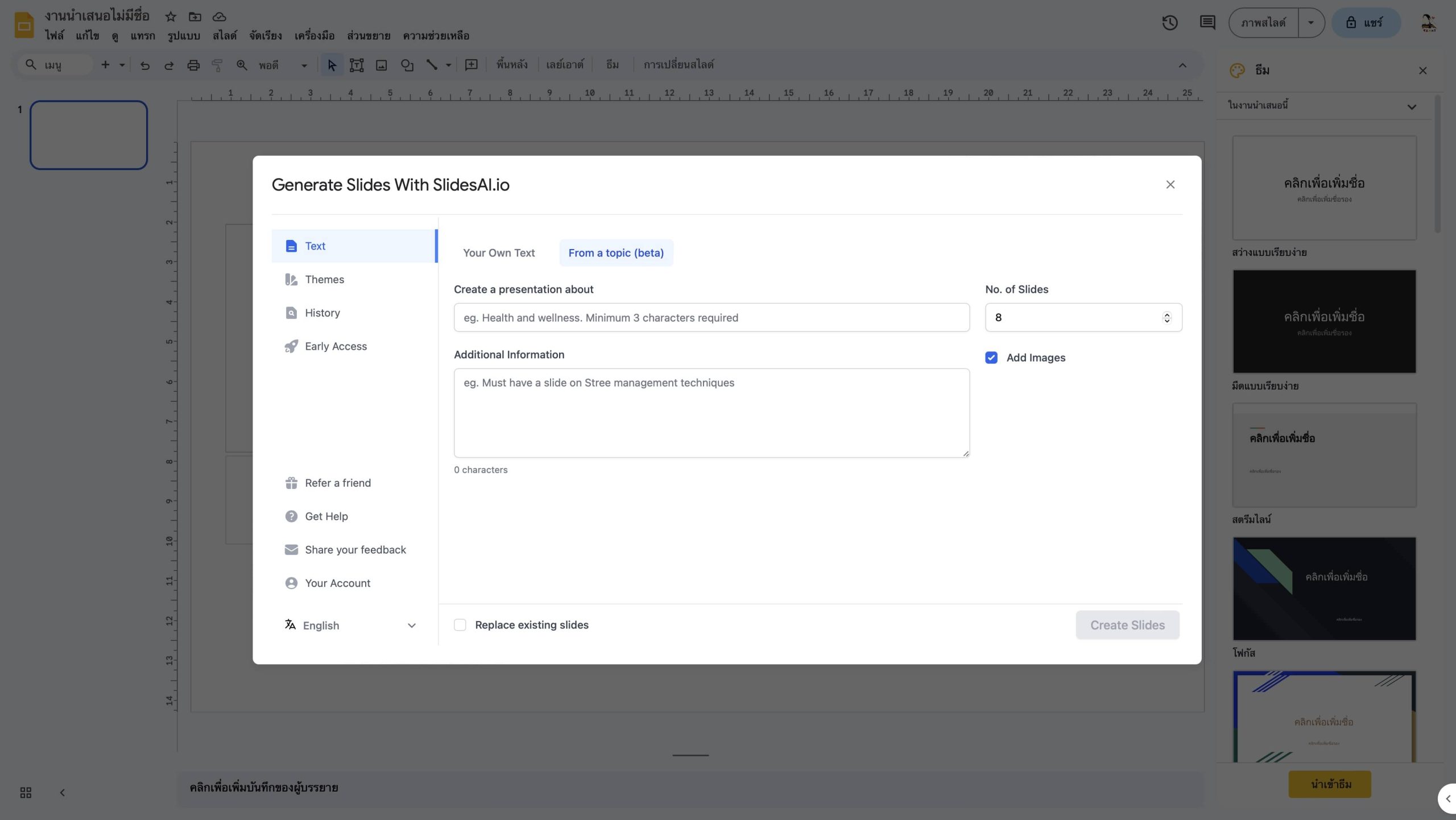 แล้วถ้าเรากด “From a topic(beta)” จะให้เราพิมพ์แค่หัวข้อที่ต้องการแล้วรอ AI ทำสไลด์ออกมาให้ แต่ตอนนี้ยังเป็นเวอร์ชั่น beta อยู่นะ