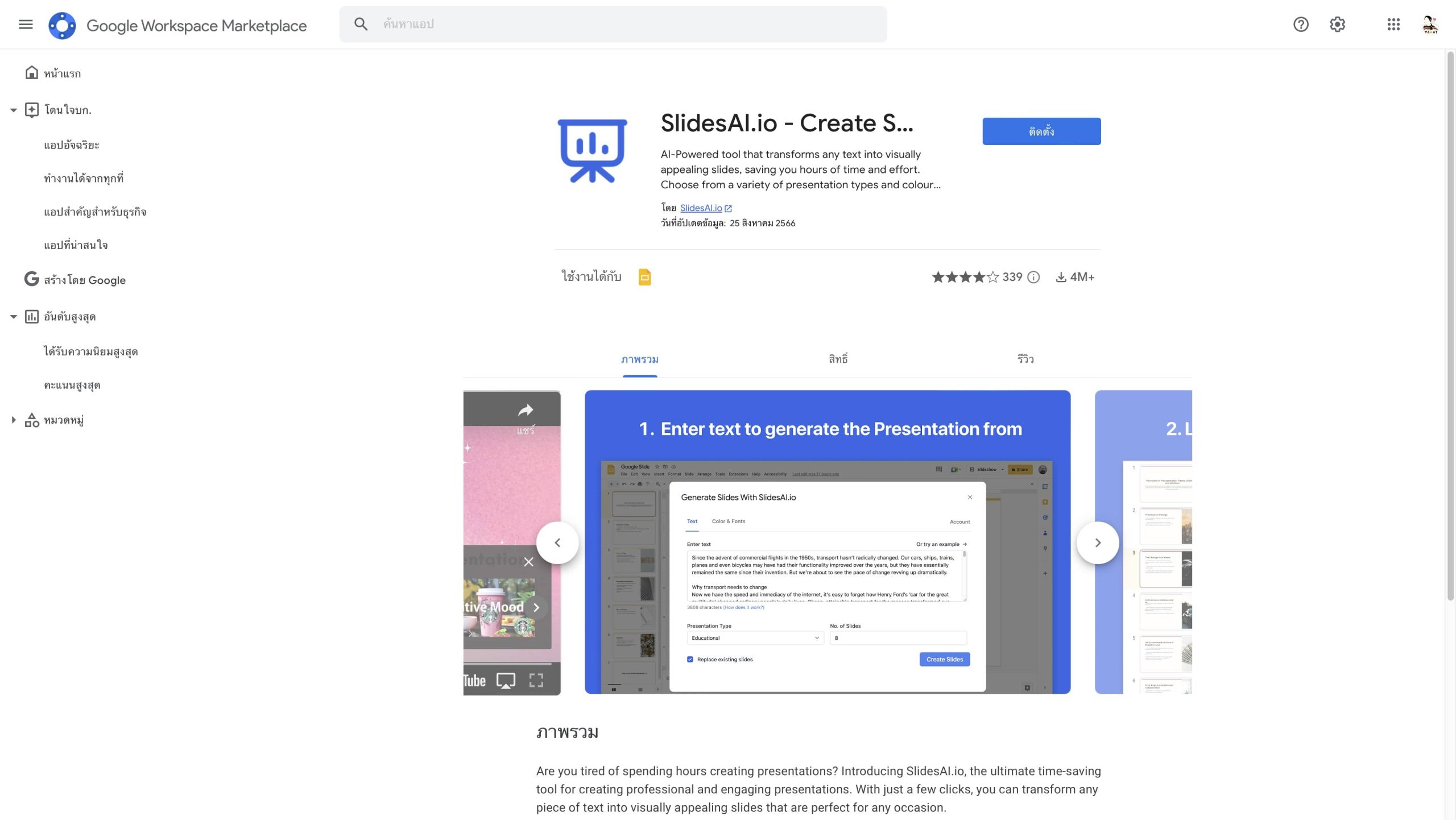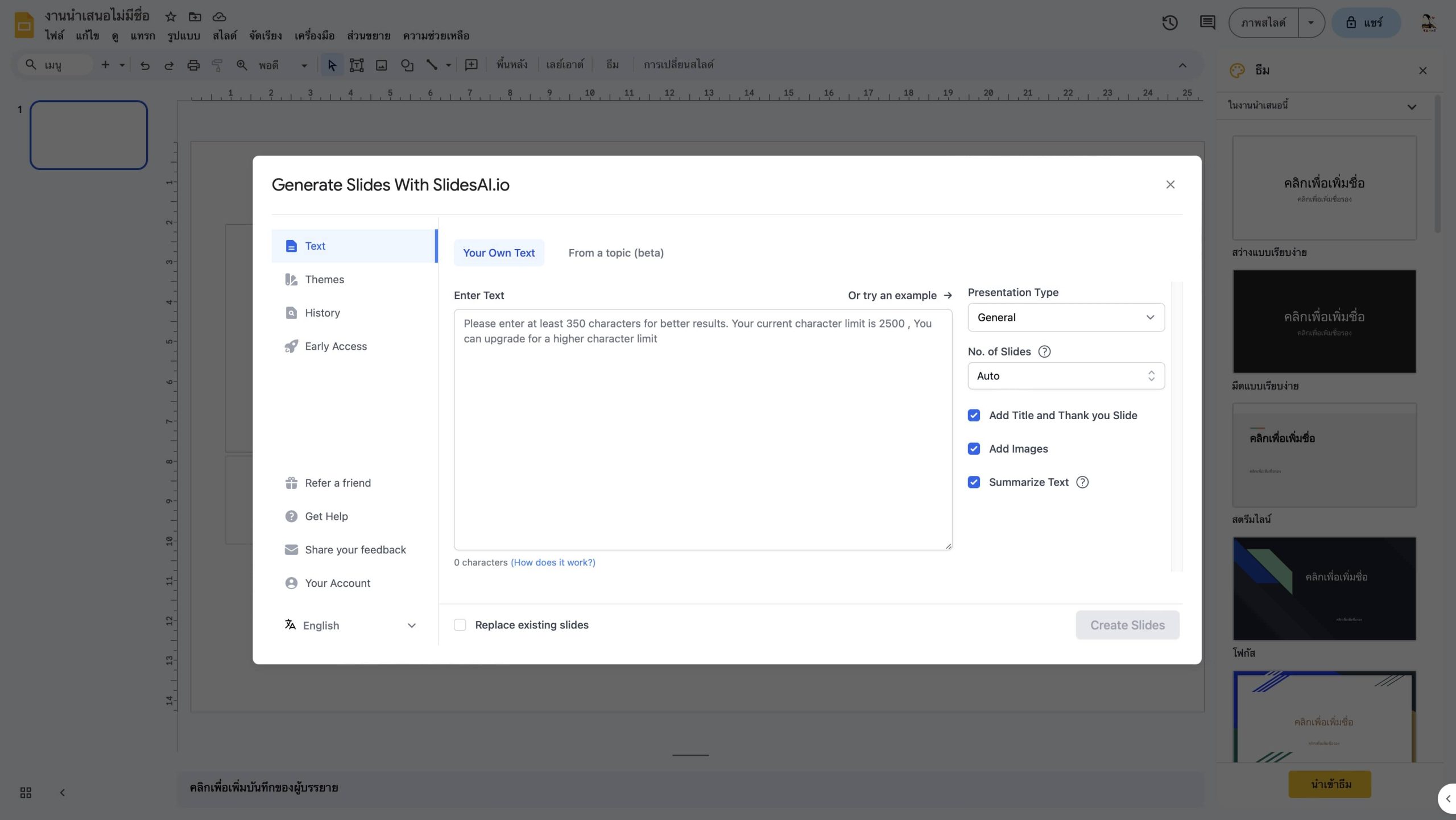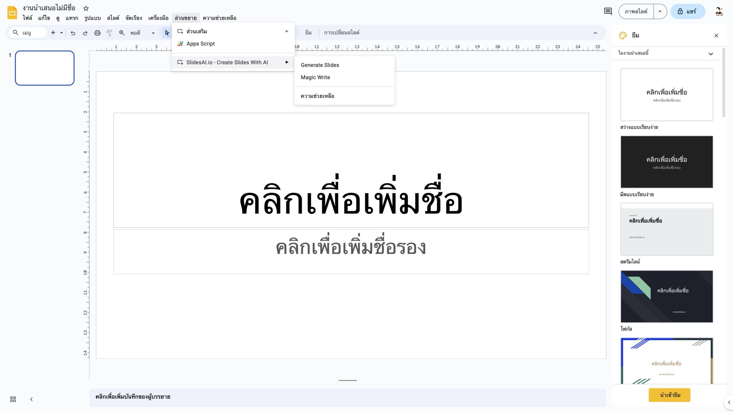 แล้วให้เรา กดส่วนขยาย > SlideAI.io > Generate Slides เพื่อเป็นการเปิดใช้งานเครื่องมือ