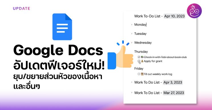 Google Workspace มีการอัปเดตฟีเจอร์ใหม่ใน Google Docs ที่สามารถกดย่อและขยายส่วนหัวของเนื้อหาต่าง ๆ ภายในเอกสารได้ ช่วยให้จัดการเนื้อหาบนเอกสารได้สะดวกและง่ายมากยิ่งขึ้น หากไม่ต้องการแสดงเนื้อหาบางส่วนบนเอกสาร ก็สามารถกดซ่อนเนื้อหาได้เลยเจ้าของเอกสารสามารถตั้งค่าการแสดงเนื้อหาย่อยได้ว่าจะให้ขยายหรือย่อเนื้อหา และเมื่อแชร์เอกสารให้ผู้ใช้ที่มี “สิทธิ์ดูและแสดงความคิดเห็น” ก็จะสามารถขยายหรือยุบเพื่อดูเนื้อหาได้ แต่เมื่อปิดเอกสารไปแล้ว การทำงานของผู้เช้าชมจะไม่มีการเปลี่ยนแปลง โดยเนื้อหาจะยังคงเป็นค่าเริ่มต้นตามที่เจ้าของตั้งค่าไว้