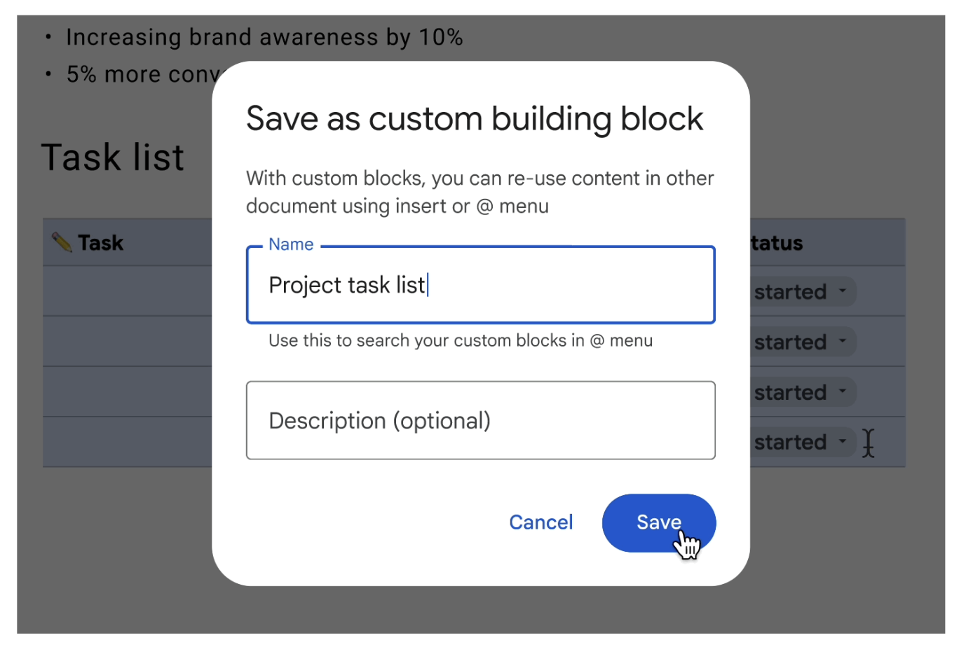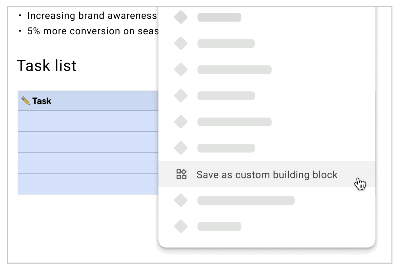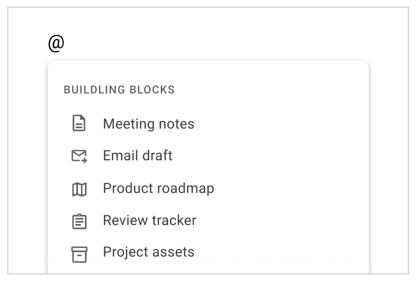 ผู้ใช้สามารถสร้างแบบเอกสารสำเร็จรูปที่กำหนดเองใน Google Docs ได้ ไม่ว่าจะเป็นข้อความ ตาราง และวันที่ โดยสามารถบันทึกและแทรกเอกสารสำเร็จรูป (Building Blocks) ที่ถูกสร้างขึ้นไว้ในเอกสารอื่น ๆ ได้
