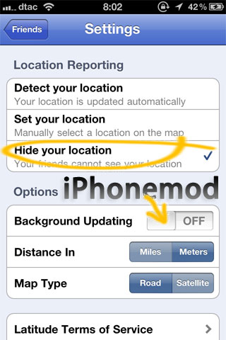 เลือกติ๊ก Hide your location และตั้ง Background Updating เป็น OFF