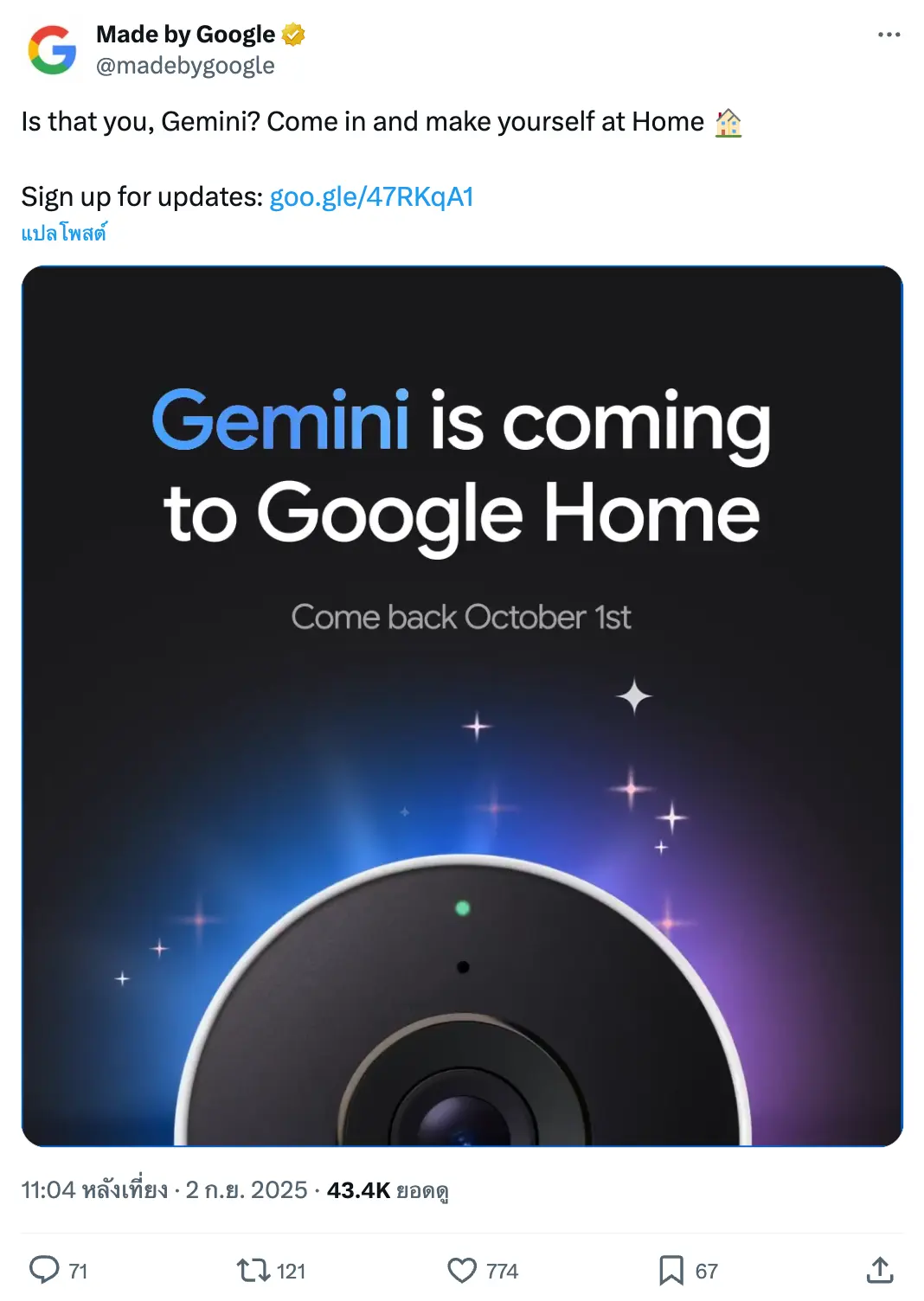 Google ได้โพสต์บน X/Twitter ว่า “Gemini is coming to Google Home” พร้อมแท็กไลน์ว่า “กลับมาอีกครั้งในวันที่ 1 ตุลาคม” แม้ว่ายังไม่ได้ยืนยันอย่างเป็นทางการว่า Gemini จะพร้อมใช้งานตั้งแต่วันที่ 1 ตุลาคม 2025 บนอุปกรณ์ Google Home หรือไม่