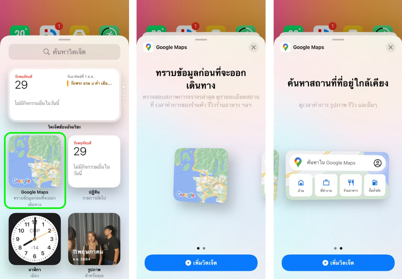 เรียกใช้วิตเจ็ตด้วยการแตะค้างที่หน้าจอโฮม จากนั้นจะเห็นวิดเจ็ต Google Maps มาให้เราใข้งาน