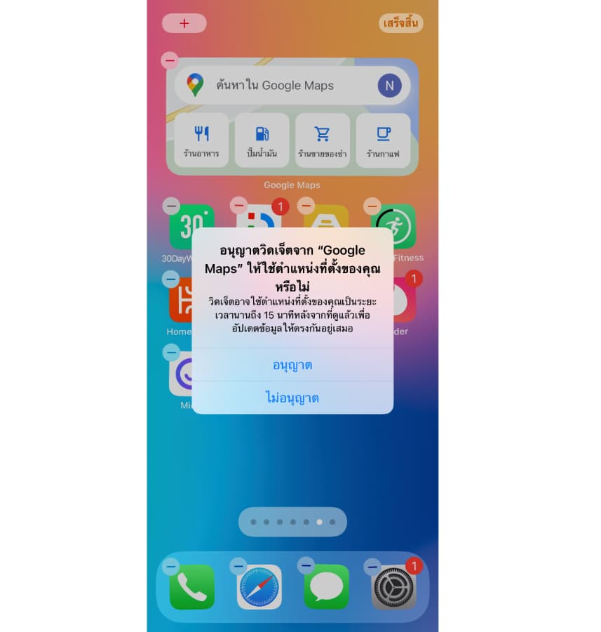 เมื่อเลือกใช้งานวิดเจ็ตจะมีคำขออนุญาตเพื่อเปิดการใช้งานตำแหน่งที่ตั้งจากตัววิตเจ็ต ให้แตะ “อนุญาต” เพื่อใช้งานวิตเจ็ตนี้