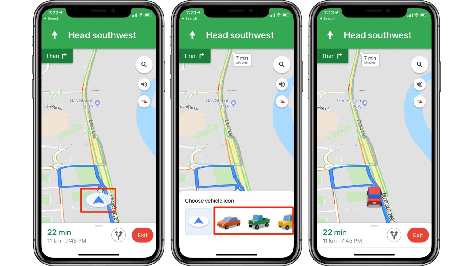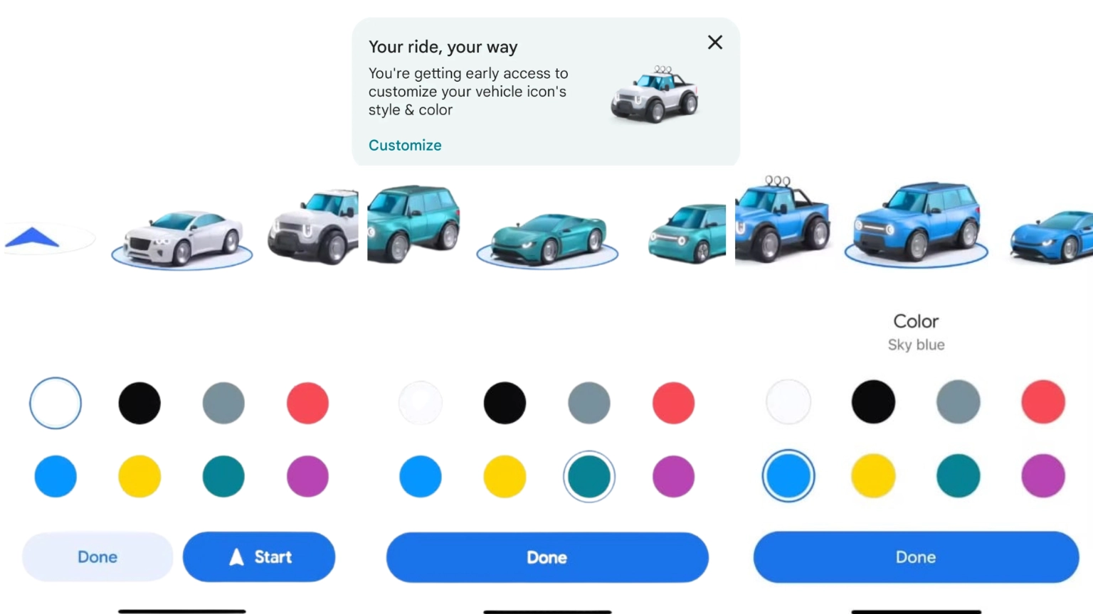 • ตัวเลือกเพิ่มเติม : นอกจากนี้ Google Maps ยังมีตัวเลือกไอคอนรถยนต์แบบเดิมให้ผู้ใช้เลือกใช้อีกสี่แบบ ได้แก่ ลูกศรในวงกลมสีขาว, รถเก๋งสีแดง, รถ SUV สีเหลือง, หรือรถกระบะสีเขียว