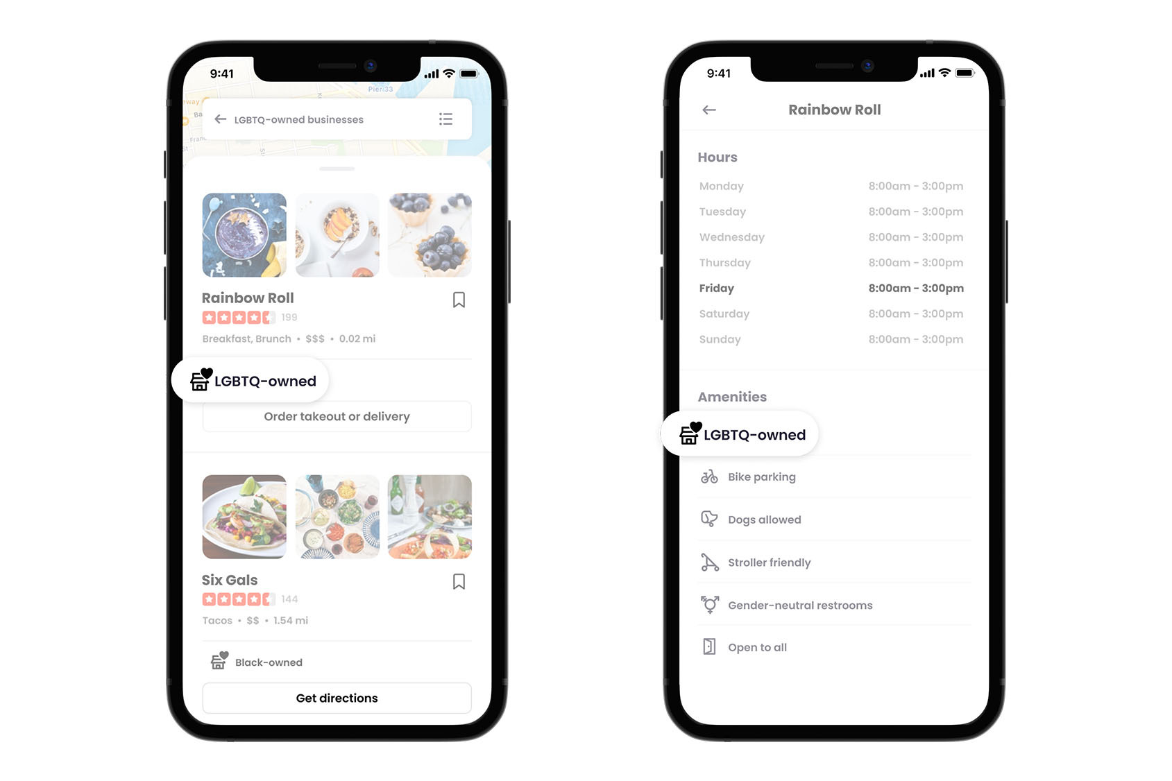 และในปี 2018 ทางบริษัทได้เพิ่มวิธีให้เจ้าของธุรกิจได้แสดงให้เห็นว่าร้านค้าของพวกเขาเป็นมิตรกับ LGBTQ และสถานที่ที่ปลอดภัยสำหรับคนข้ามเพศ ขณะเดียวกัน The Verge ได้รายงานว่า Yelp ได้เปิดตัวป้ายกำกับธุรกิจของ LGBTQ+ ที่คล้ายกันกับ Google เมื่อปี 2021 ที่ผ่านมา