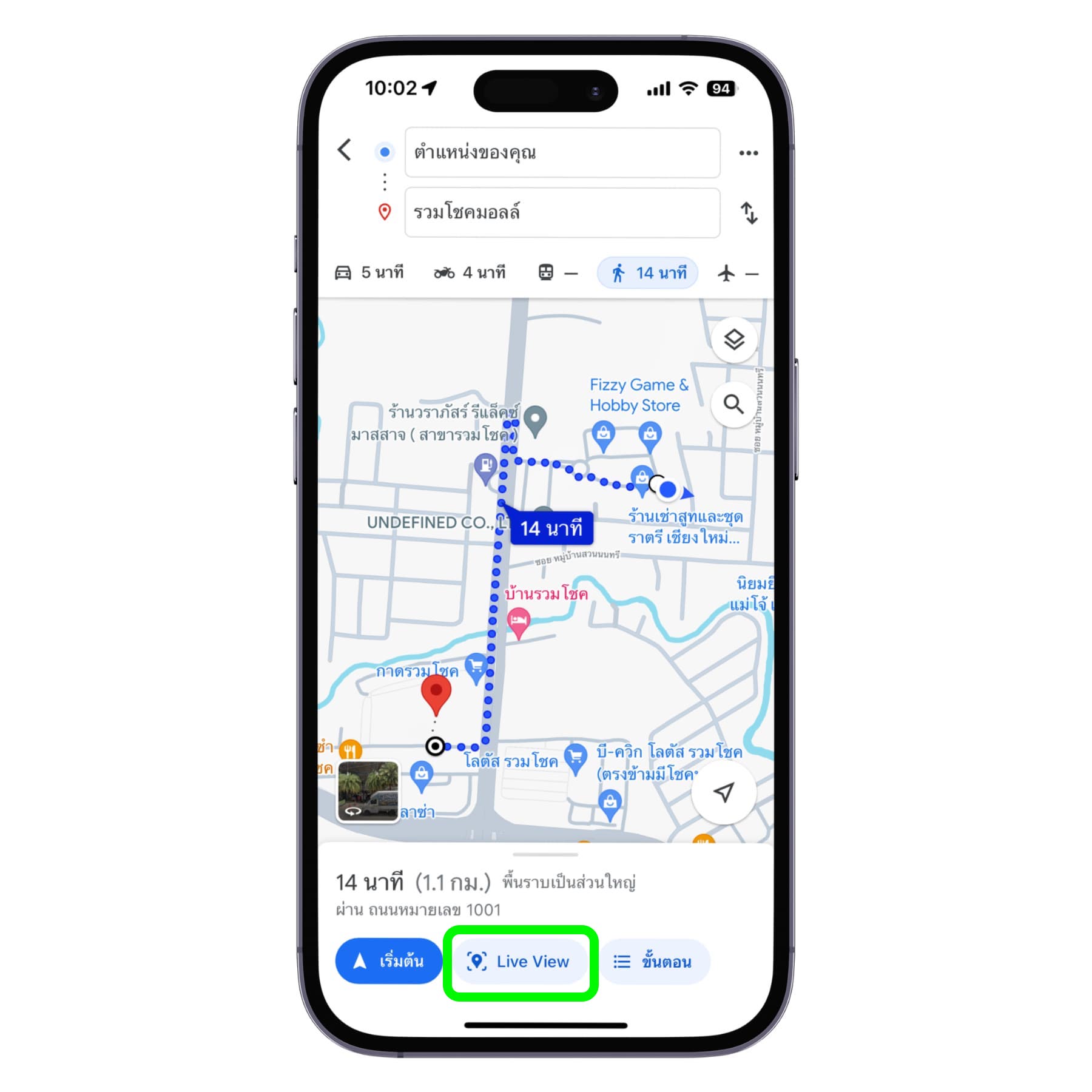 Live View เป็นฟีเจอร์ในแอป Google Maps โดยเป็นการนำทางแบบ AR ซึ่งจะอยู่ในฟีเจอร์การเดินทางด้วยด้วยการ “เดิน” ใน Apple Google Maps เลย ระหว่างที่ใช้งานจะมีใช้ลูกศรชี้บนสถานที่จริงแบบ Real-time