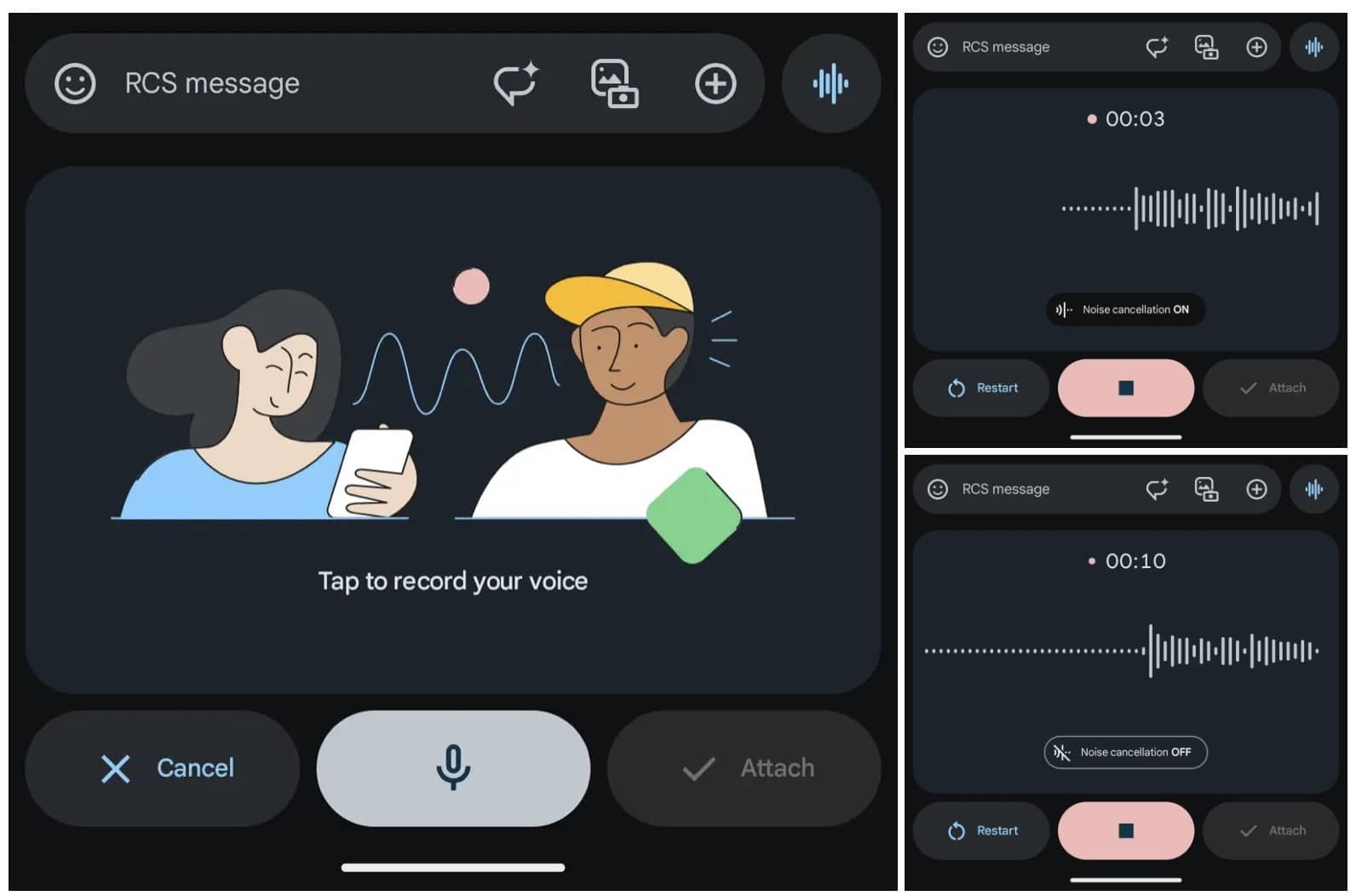 โดยปกติแล้วถ้าเราอัดเสียงบนแชท SMS ก็เพียงแค่กด “ปุ่มอัดเสียง” จากนั้นก็จะแสดงฟีเจอร์ที่ให้เราสามารถเลือกได้ว่าจะตัดเสียงรบกวนหรือไม่ และยังมีการอัดแบบลากยาวเพื่อทำให้การอัดง่ายขึ้นด้วย