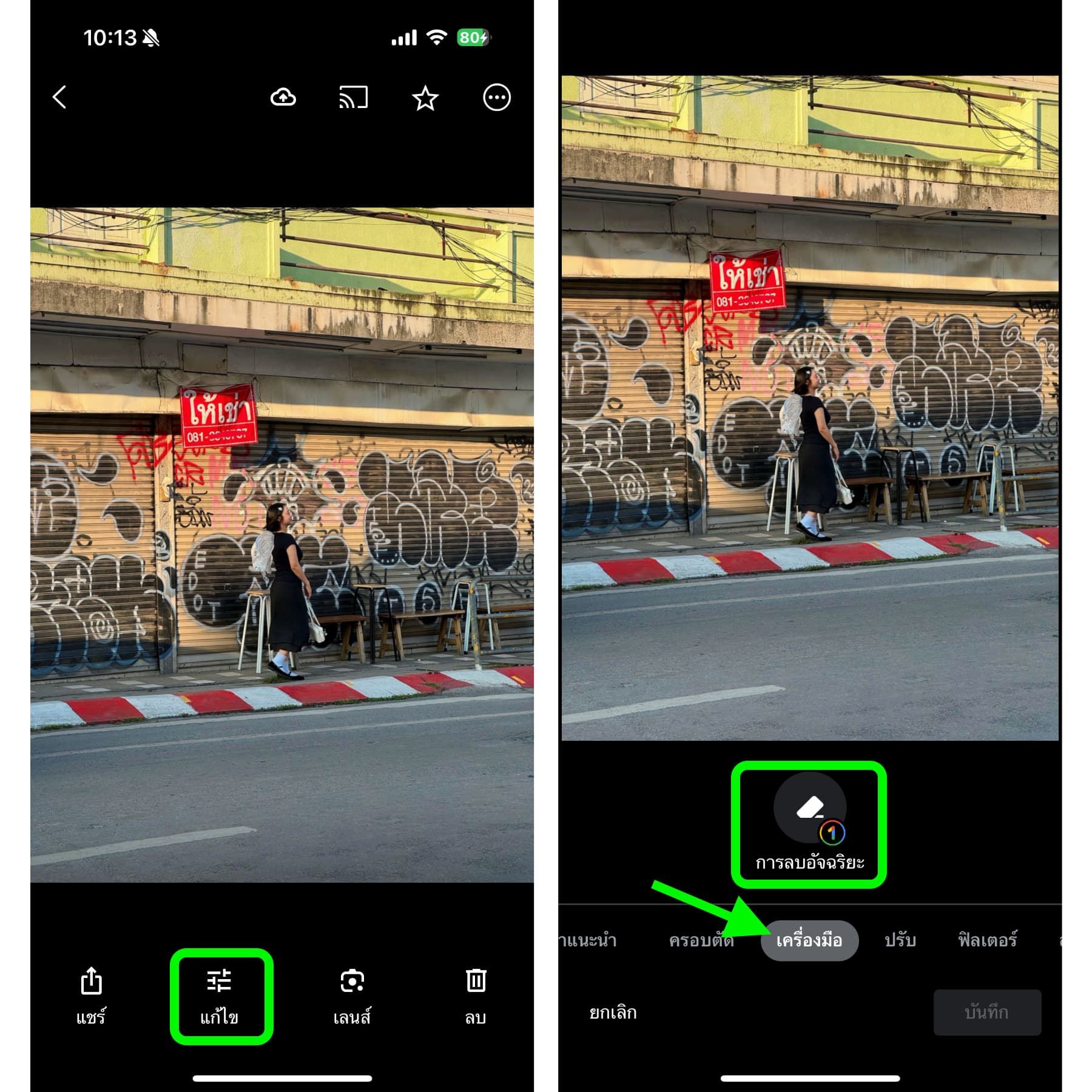 เข้ามาที่แอป Google Photos > เลือกรูปภาพที่ต้องการ > แตะ “แก้ไข” > เลือก “เครื่องมือ” จากนั้นจะมีฟีเจอร์ “การลบอัจฉริยะ” ปรากฏขึ้นมา