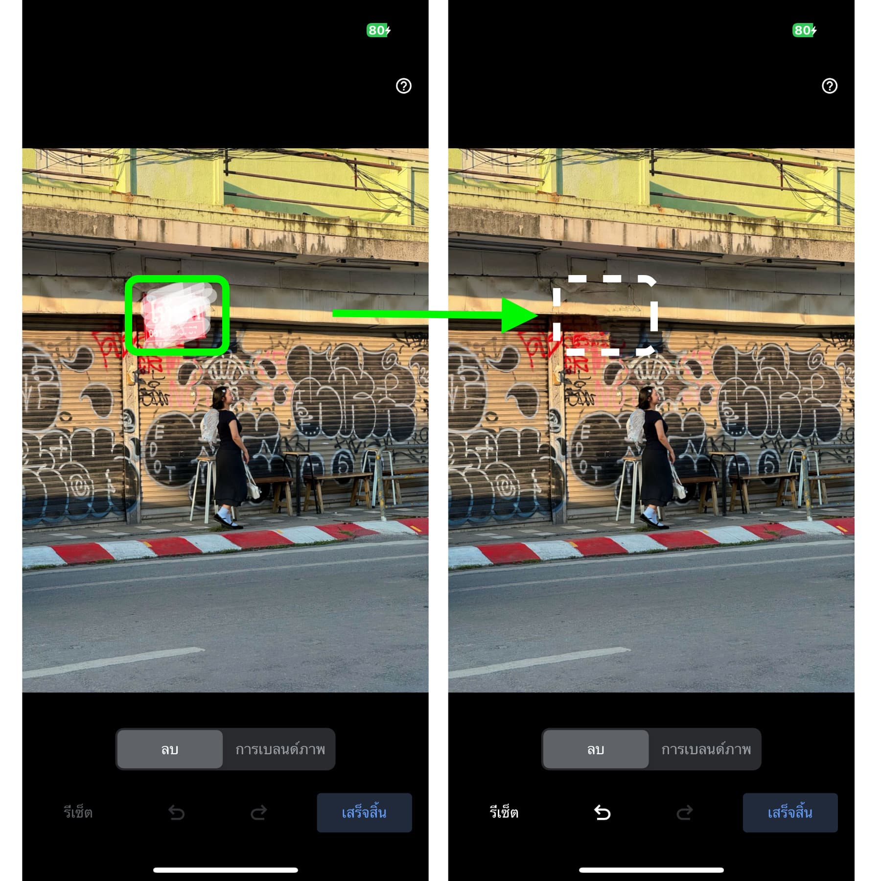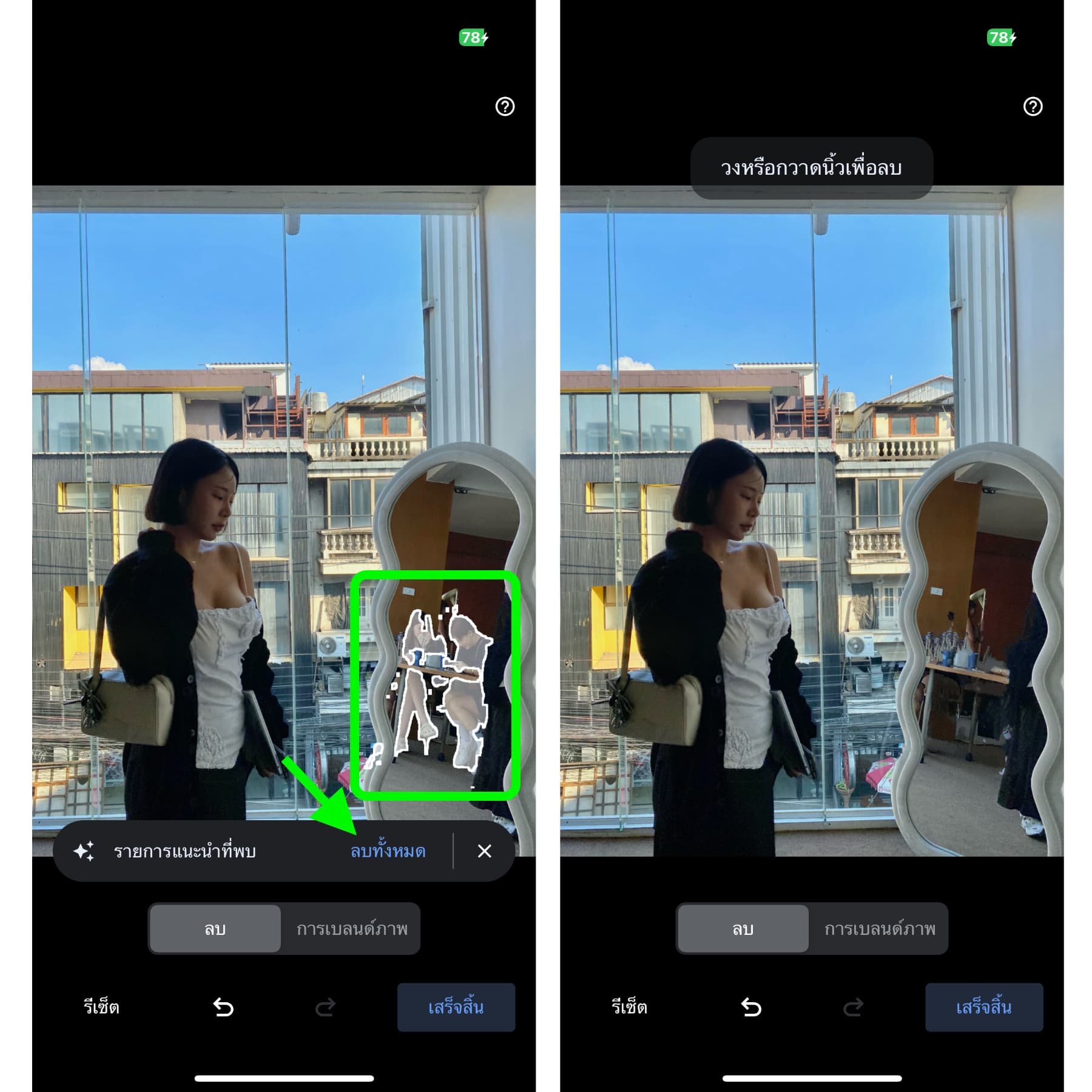 หาก AI ตรวจสับได้ว่าในรูปของเรามีคนอยู่ จะมีการ Select คนในรูปให้อัตโนมัติ จากนั้นให้เราแตะ “ลบทั้งหมด” แค่นี้ก็เป็นอันเสร็จ ลบคนออกจากรูปได้ภายใน 1 วินาที!