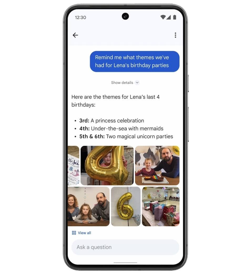 ฟีเจอร์ Ask Photos จะมีการวิเคราะห์คำถามของเราผ่าน Gemini โดยที่ Gemini จะช่วยค้นหาภาพต่าง ๆ ในคลังของเรา โดยพิจารณา จาก สถานที่ บุคคล วันที่ และอื่น ๆ ตัวอย่างเช่น “งานเลี้ยงวันเกิด”