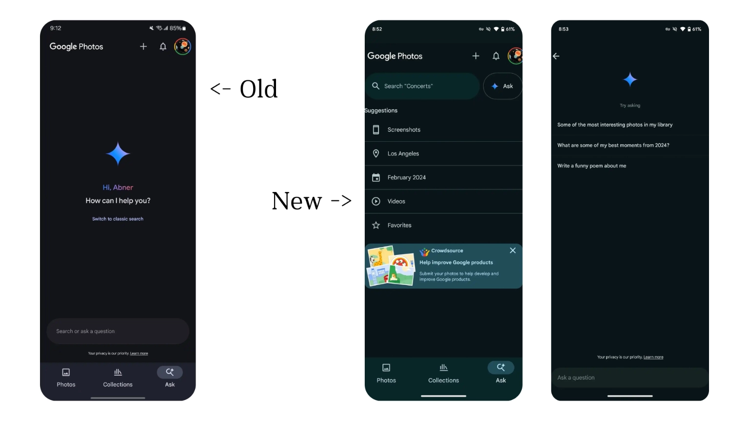 ลดความโดดเด่นของ UI แบบแชท : เดิมที เมื่อแตะที่แถบ “ค้นหา” จะเข้าสู่หน้าจอแชทเต็มรูปแบบ แต่ปัจจุบัน Google ได้นำหน้าจอค้นหาแบบเดิมกลับมา โดยมีช่องสำหรับคำแนะนำต่างๆ เช่น ภาพหน้าจอ, วิดีโอ, รายการโปรด และมีปุ่ม “ถาม” แยกต่างหาก ซึ่งเมื่อกดแล้วถึงจะเข้าสู่หน้าจอแชท การเปลี่ยนแปลงนี้ทำให้ผู้ใช้เข้าถึงการค้นหาแบบเดิมได้ง่ายขึ้น และไม่จำเป็นต้องใช้การสนทนาแบบแชทเสมอไป