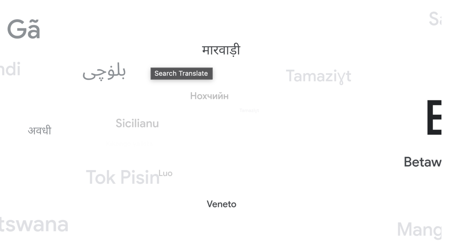Translate รองรับเกือบ 250 ภาษา และมีคู่ภาษามากกว่า 60,000 แบบ รวมถึงภาษาใกล้สูญพันธุ์และภาษาท้องถิ่น เพื่อให้ผู้คนทั่วโลกได้มีเสียงในโลกที่เชื่อมถึงกันมากขึ้น