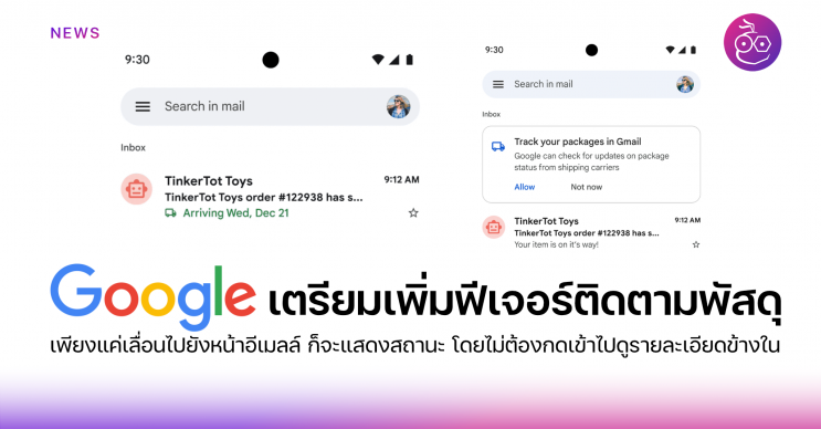 Google เตรียมเพิ่มฟีเจอร์ติดตามพัสดุ ใช้งานได้บน Gmail เพียงแค่เราเลื่อนไปยังหน้าอีเมลล์ ฟีเจอร์ก็จะทำการแจ้งสถานะทันที โดยไม่ต้องกดเข้าไปดูรายละเอียดข้างใน
