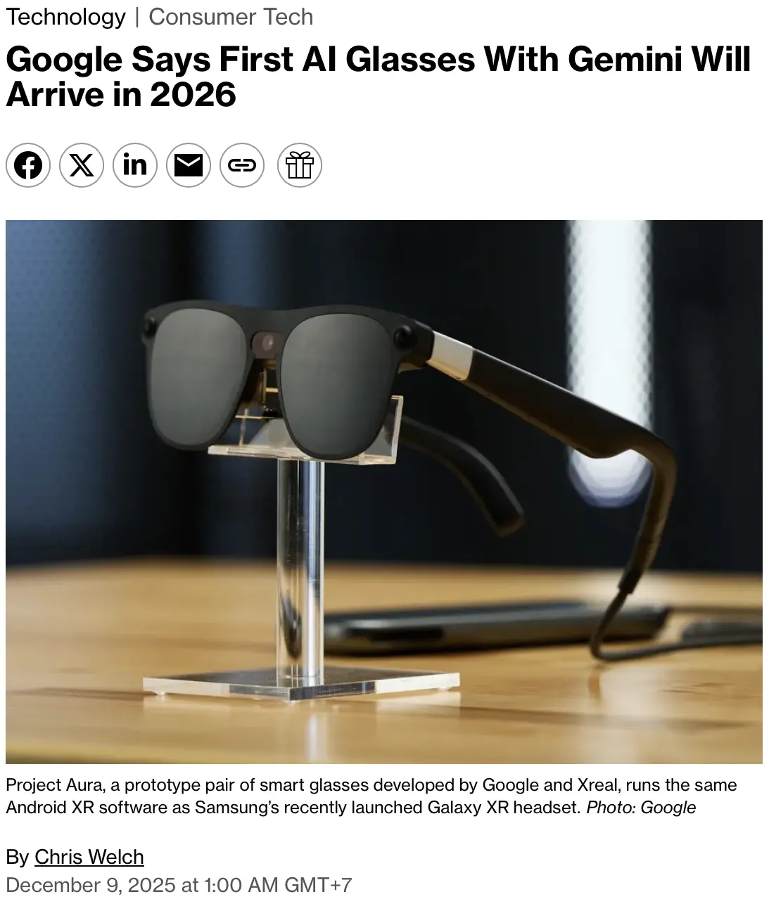 Google กำลังพัฒนาแว่นตาอัจฉริยะ 2 รุ่นที่มีระบบปัญญาประดิษฐ์ (AI) โดยมีกำหนดเปิดตัวในปี 2026 แว่นตารุ่นแรกได้รับการออกแบบมาเพื่อให้เป็นผู้ช่วยด้วย AI โดยไม่ต้องใช้หน้าจอ มาพร้อมลำโพง, ไมโครโฟน และกล้องในตัว เพื่อให้ผู้ใช้สามารถโต้ตอบกับ Google Gemini