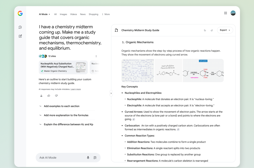 และ เปิดตัว Canvas ครั้งแรกในเดือนมีนาคมผ่าน Gemini ซึ่งเป็นพื้นที่ทำงานที่ผู้ใช้สามารถขอให้ Gemini ช่วยปรับแต่งงานเขียน สร้างแอป เกม แบบทดสอบเชิงโต้ตอบ และอื่นๆ โดยการรวม Canvas เข้า AI Mode จะช่วยให้นักเรียนสร้างคู่มือการเรียนรู้ได้ง่ายขึ้น ผ่านการดึงข้อมูลเข้าสู่แถบด้านข้างของ Canvas และปรับแต่งผลลัพธ์ตามที่ต้องการโดยถามคำถามเพิ่มเติมได้ทันที