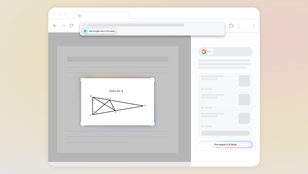 Google ยังปรับปรุงการเข้าถึง Lens (ค้นหาจากรูปภาพ) บน Chrome ให้สะดวกขึ้น ด้วยการเพิ่มตัวเลือก “Ask Google about this page” ที่แสดงขึ้นเมื่อผู้ใช้คลิกในแถบที่อยู่ (address bar) โดยผู้ใช้สามารถเลือกเนื้อหาที่ต้องการค้นหาบนหน้าเว็บ และให้ AI สรุปข้อมูลในแถบด้านข้างของเบราว์เซอร์ได้ทันที