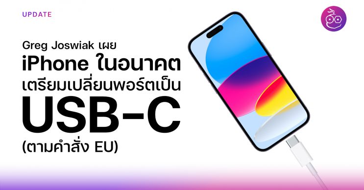 Greg Joswiak ผู้บริหารฝ่ายการตลาดของ Apple ได้พูดในงาน Tech Live ของ Wall Street Journal ว่า Apple พร้อมปฏิบัติตามคำสั่งของ EU หากมีกฎหมายออกมาว่าอุปกรณ์อิเล็กทรอนิกส์ สมาร์ตโฟนต้องใช้พอร์ต USB-C เป็นพอร์ตมาตรฐาน