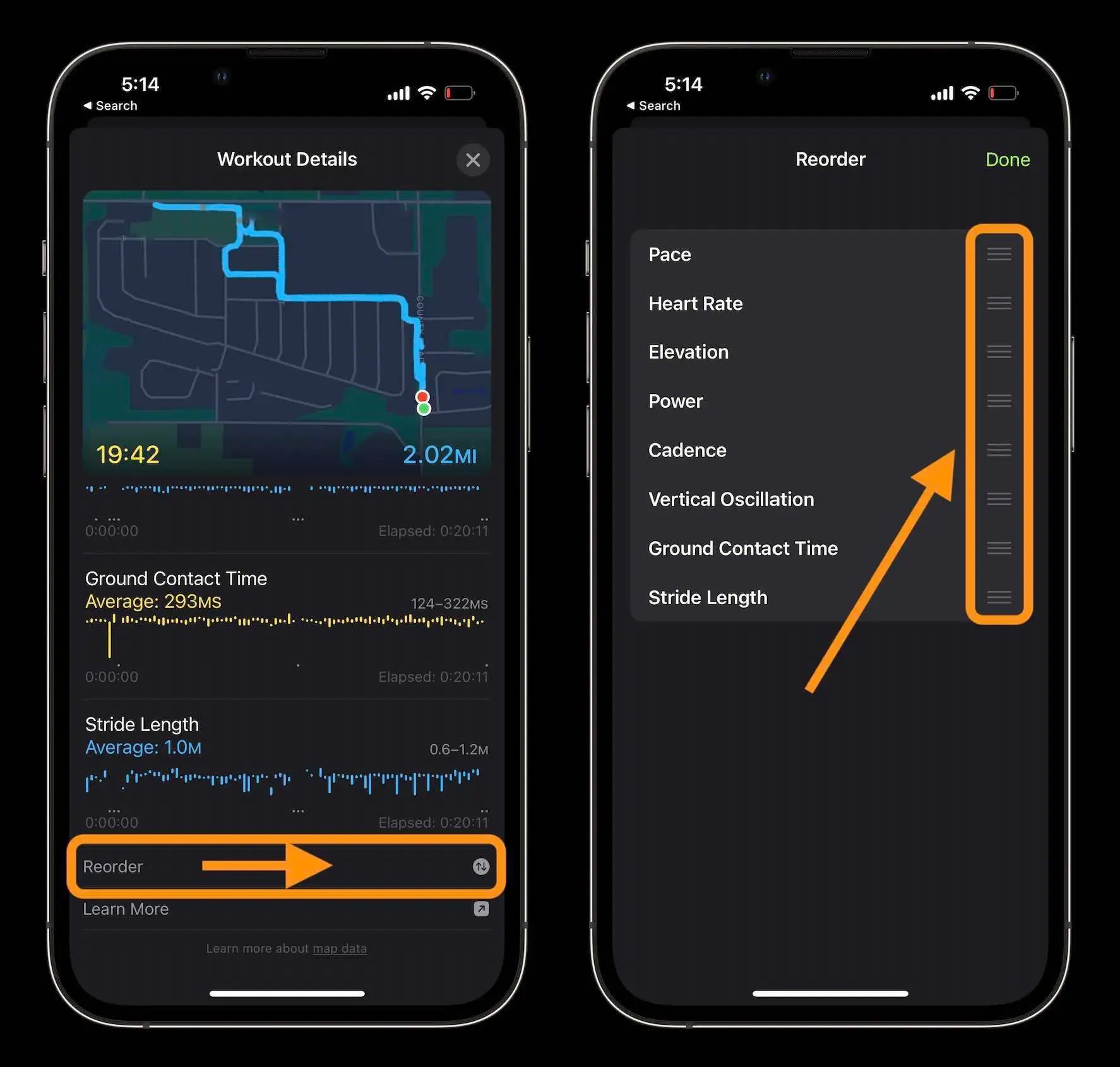 ในส่วนข้อมูลจะมี เพซ, อัตราการเต้นของหัวใจ, ระดับความสูง, พลัง, ความเร็วรอบขาเฉลี่ย, ค่าการกระเด้งตัวขณะวิ่ง, ระยะเวลาที่เท้าเหยียบพื้นในขณะวิ่ง และระยะทางของเท้าหน้าและเท้าหลัง ถ้าเลื่อนลงมาด้านล่างสุด เราจะพบกับส่วนของการจัดเรียงข้อมูลที่ผู้ใช้สามารถปรับแต่งได้เอง