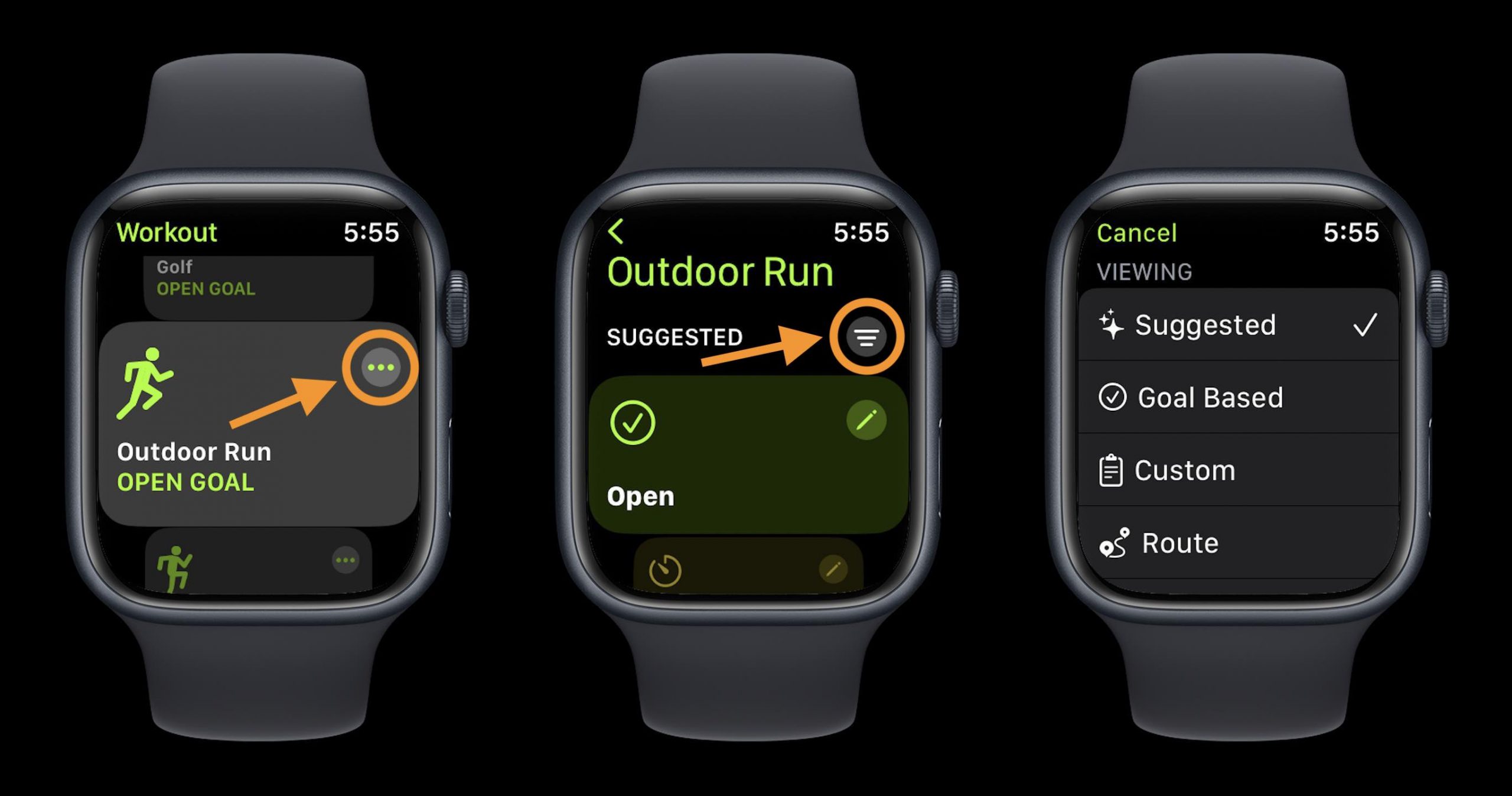 ระหว่างที่เราใช้งานแอปออกกำลังกาย (Workout) บน Apple Watch ถ้าเราแตะไอคอน 3 จุดที่มุมขวาของการออกกำลังกาย ก็จะพบกับตัวเลือกเพิ่มเติม ที่จะมีทั้งคำแนะนำสำหรับการเลือกสถิติครั้งล่าสุดหรือสถิติที่ดีที่สุดของเรามาแข่งในการออกกำลังกาย ได้แก่ วิ่งตามเป้าหมาย, กำหนดการวิ่งเอง หรือจะวิ่งตามเส้นทาง