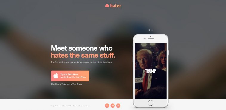 แอปพลิเคชันนี้ก็ไม่ต่างจากแอปฯ หาคู่ทั่วไป เพียงแต่มีประเด็นให้เราเกลียดหลายพันเรื่อง รวมถึงประธานาธิบดี Donald Trump ที่กำลังเป็นประเด็นอยู่ในตอนนี้ ส่วนเรื่องเล็ก ๆ น้อย ๆ อย่างไลฟ์สไตล์ส่วนตัว รสนิยม ฯลฯ มีให้เลือกครบหมด