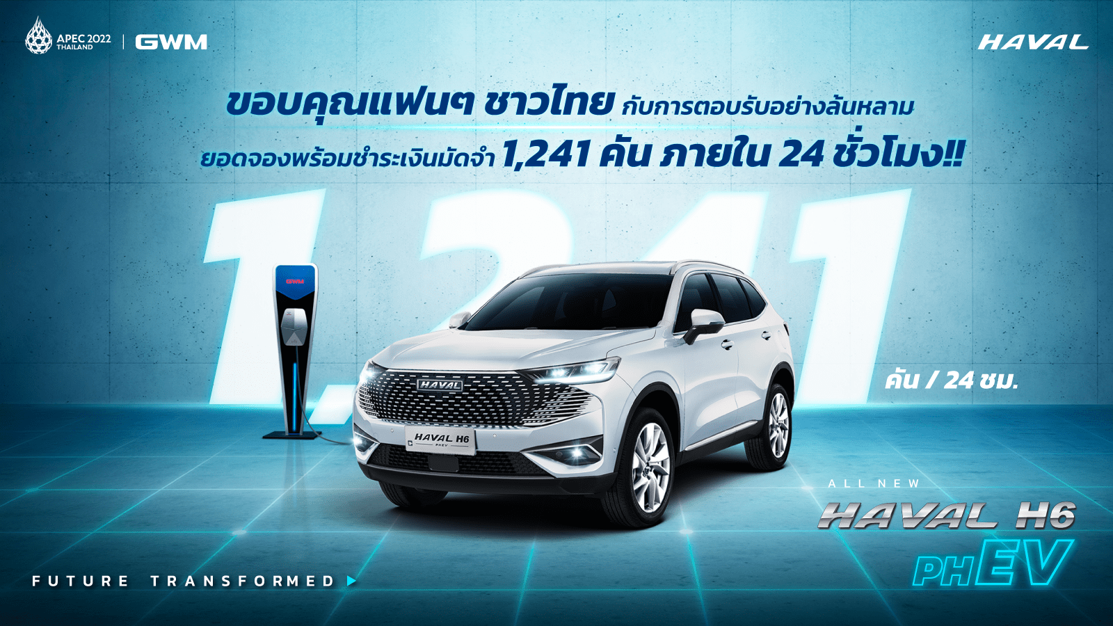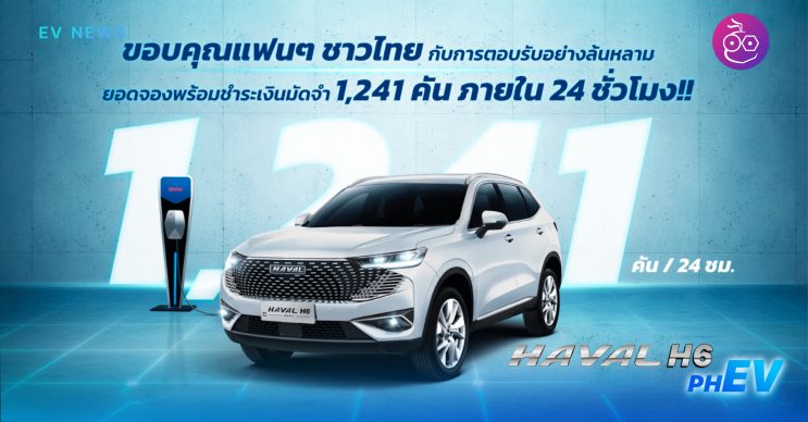 GWM ขอบคุณกระแสตอบรับอันล้นหลามสำหรับ All New HAVAL H6 Plug-in Hybrid SUV ในประเทศไทยกวาดยอดจองพร้อมชำระเงินมัดจำไปทั้งสิ้น 1,241 คันภายใน 24 ชั่วโมงแรกหลังประกาศราคาอย่างเป็นทางการ