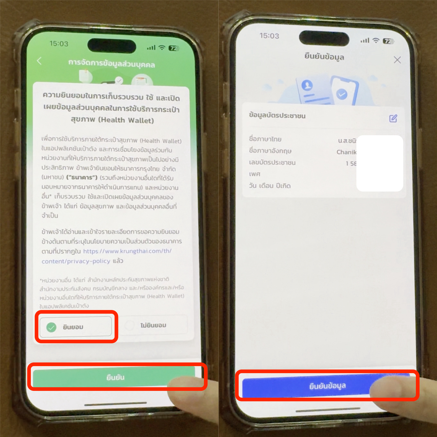 ยินยอมการจัดเก็บข้อมูลส่วนบุคคล > ตรวบสอบข้อมูลส่วนตัวและกด “ยืนยันข้อมูล”